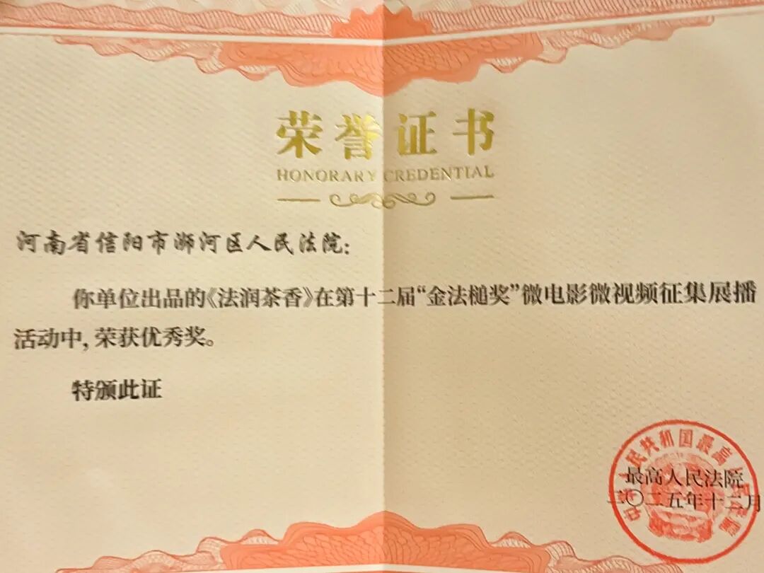 由最高人民法院政治部、最高人民法院新聞局、人民法院新聞傳媒總社等單位聯(lián)合主辦的第十二屆“金法槌獎”微電影微視頻征集展播活動共征集到31個?。ㄗ灾螀^(qū)、直轄市)作品1580部。信陽法院6部作品入圍,其中2部作品獲獎——羅山縣法院作品《斤斤“鯽”較》獲評“金法槌獎”微視頻類三等獎,浉河區(qū)法院作品《法潤茶香》獲評“金法槌獎”微電影類優(yōu)秀獎。