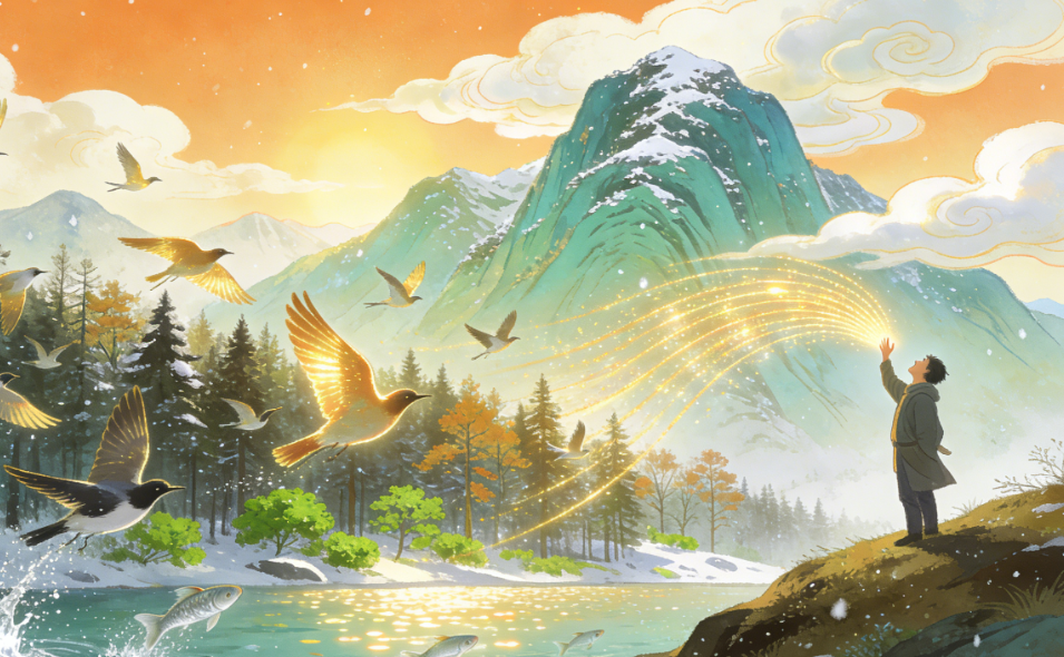雪鴻展翼向霄去,牛馬撒蹄河岸歡。