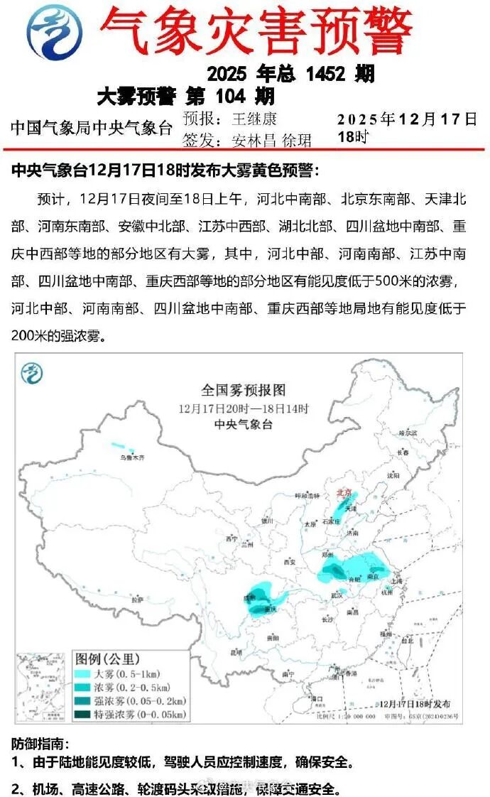 預計,12月17日夜間至18日上午,河北中南部、北京東南部、天津北部、河南東南部、安徽中北部、江蘇中西部、湖北北部、四川盆地中南部、重慶中西部等地的部分地區有大霧,其中,河北中部、河南南部、江蘇中南部、四川盆地中南部、重慶西部等地的部分地區有能見度低于500米的濃霧,河北中部、河南南部、四川盆地中南部、重慶西部等地局地有能見度低于200米的強濃霧。