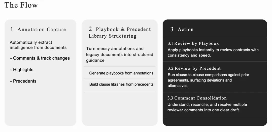 2023年,隨著大模型能力的躍遷,葉賢明逐漸形成一個(gè)判斷:真正的突破口,不在于“AI能不能讀懂合同”,而在于“AI是否能進(jìn)入真實(shí)工作流,并繼承專業(yè)判斷邏輯”。