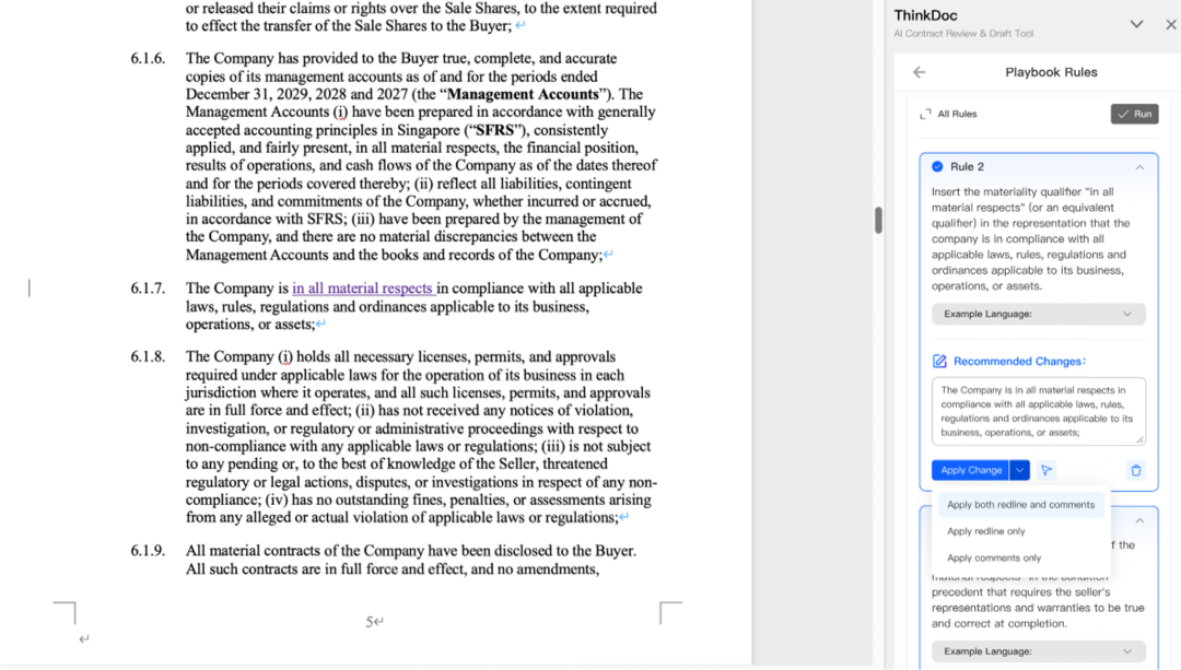 通過將資深律師與專業(yè)人員的判斷邏輯沉淀為Playbook,并在每一次AI審查中明確標(biāo)注修改依據(jù)、風(fēng)險(xiǎn)來源與參考標(biāo)準(zhǔn),初級(jí)人員不再只是被動(dòng)執(zhí)行修改,而是可以直接看到: