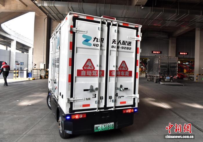 12月17日,位于河北省廊坊市開發區的一家快遞轉運中心,一輛無人配送車開始“工作”。中新社記者 翟羽佳 攝