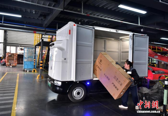 12月17日,位于河北省廊坊市開發區的一家快遞轉運中心,工作人員裝運無人配送車。中新社記者 翟羽佳 攝