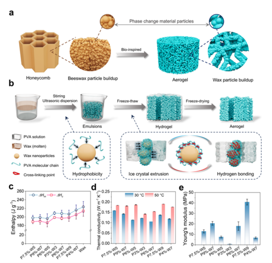 蜜蜂筑巢,恐怕是再普通不過的動物活動。然而,正是受此啟發,近期,北京理工大學軟物質力學團隊在熱管理領域取得突破。氣凝膠是一種超輕、多孔且隔熱性能優異的熱管理材料,廣泛應用于航空航天、建筑節能、電子設備散熱以及新能源電池熱防護等眾多領域。然而,其傳統設計僅聚焦于隔熱功能而未整合儲放熱特性,在應對溫度交替變化的外部環境時,限制了其空間恒溫調控能力。科學家發現,通過引入相變材料可有效集成儲放熱功能,有望在同一材料體系中同步實現高儲能密度、強力學性能與優異循環穩定性的協同。當前,相變氣凝膠的主流設計策略主要分為嵌入式與均質化兩類:嵌入式方法需將負載微膠囊化或將顆粒狀相變材料混合到氣凝膠基質,但高負載條件下界面粘附力不足易導致力學性能降低;均質化方法則在分子級尺度將相變材料與支撐性聚合物交聯,卻因結晶度降低限制了潛熱值。因此,如何構建兼具穩定結構、高潛熱與低導熱特性的相變氣凝膠網絡,已成為該領域亟待突破的問題。如何破題?正是司空見慣的蜜蜂筑巢過程讓團隊受到啟發。團隊成員張凱教授在攻讀博士學位期間就對蜂窩力學及構型演化機制進行了深入研究:蜜蜂將分泌的蜂蠟放入嘴中咀嚼,然后將表面混有唾液的蜂蠟顆粒堆積到蜂巢壁上,最后用腹部壓實蜂窩壁,賦予蜂巢穩固的形態。而且,蜂蠟還能被回收再利用以再造新巢,實現資源的閉環循環。基于此,團隊提出一種新型仿生相變氣凝膠的網絡設計方法及制備技術:利用相變材料模擬“蜂蠟顆粒”,以聚合物“粘結劑”模擬經咀嚼后在蜂蠟表面附著的“天然黏合劑”,以冰模板法模擬蜜蜂用腹部壓實蜂窩壁的過程,最終基于自組裝方式構筑了相變氣凝膠。所制備材料兼具高潛熱和低熱導率,并表現出優異的抗壓性能,解決了相變氣凝膠力學性能與儲能之間難以協同的難題。本研究模擬驗證了建筑物中該新型相變氣凝膠的恒溫調控能力。研究發現,基于“隔熱+儲熱”一體化機制的相變氣凝膠,實現了長達24小時的接近恒溫調控,效果顯著優于商業氣凝膠。此外,該相變氣凝膠具有與蜂窩類似的可循環利用特性,為其在建筑、航天熱防護、冷鏈物流等領域可持續應用奠定了基礎。據介紹,該團隊相關成果發表在國際頂級期刊《ACS Energy Letters》,并入選當期封面論文。北京理工大學空天科學與技術學院助理教授左磊與北京理工大學唐山研究院—天津理工大學聯合培養碩士生溫彪為共同第一作者,北京理工大學空天科學與技術學院張凱教授、天津理工大學材料科學與工程學院趙云峰教授為共同通訊作者。(光明日報全媒體記者 周世祥)
