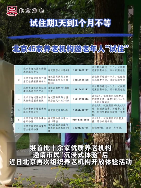 繼首批十余家優(yōu)質(zhì)養(yǎng)老機構(gòu)邀請市民“沉浸式體驗”后,近日本市再次組織養(yǎng)老機構(gòu)開放體驗活動。記者從北京市民政局了解到,參與第二批集中開放體驗活動的共有45家優(yōu)質(zhì)養(yǎng)老機構(gòu),涉及海淀、豐臺等區(qū)以及經(jīng)開區(qū),開放點位更多、活動時間更長,從而為老年人提供更多“試住”選擇。