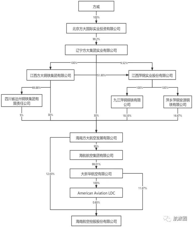2021年底,遼寧方大集團正式入主海航航空板塊。根據重整計劃,方大集團耗資380億元(外加30億元的風險救助金),對海航航空板塊(管理主體正是海航航空集團)實現絕對控股(即第一大股東),航空板塊的剩余股份,則由債權人作為受益人的“信托計劃”持有。【相關:溢價35%買海航!方大入股價揭曉】