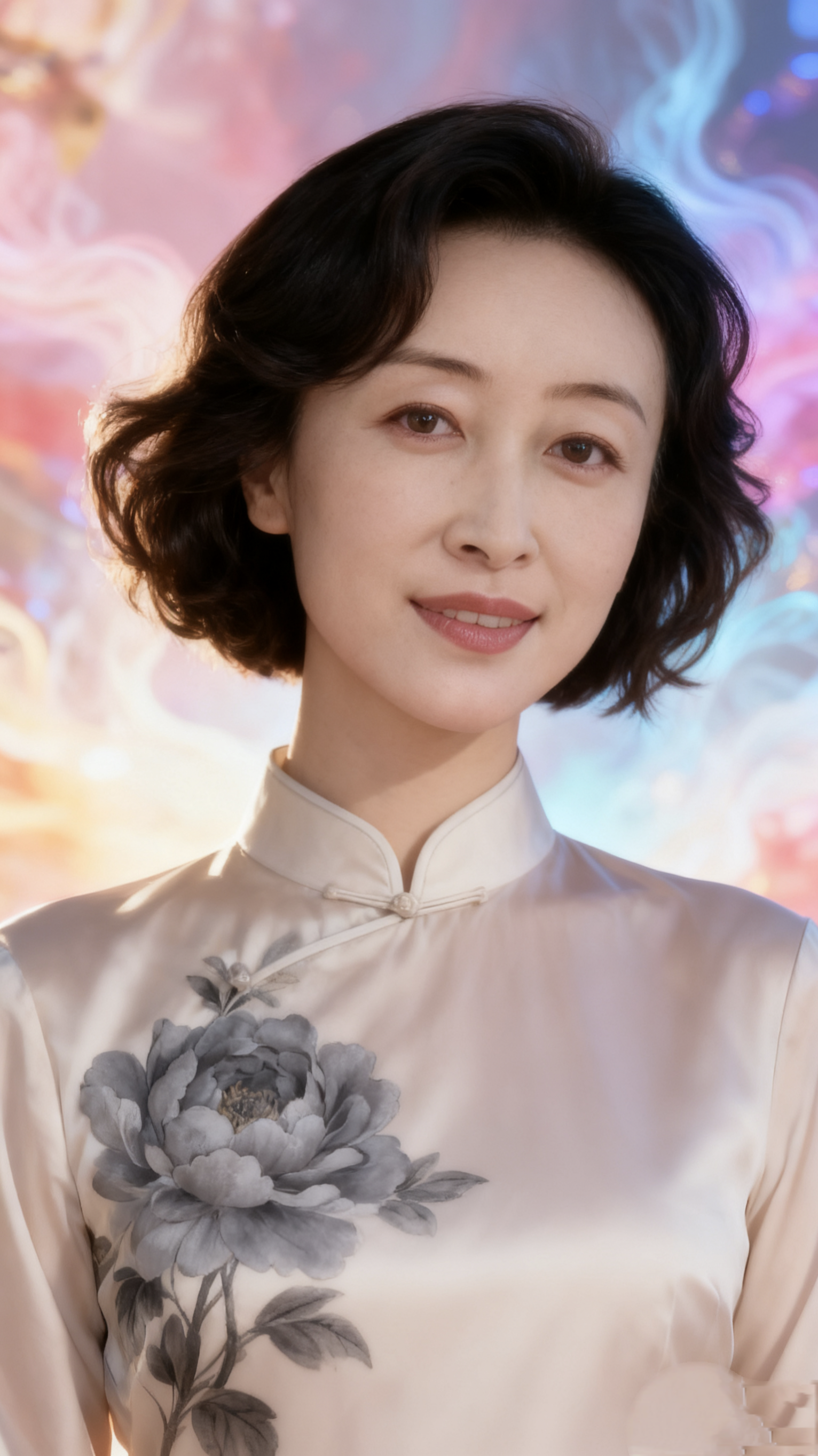 彩煙氤氳的光影里,女子身著米白真絲旗袍淺笑而立,墨色牡丹繡于襟側,似從水墨長卷中暈染而出。復古的波浪卷發襯著溫潤的眉眼,唇間的淡粉與旗袍的柔白相映,把東方的雅致與歲月的溫柔,揉進了這方彩煙繚繞的天地里。