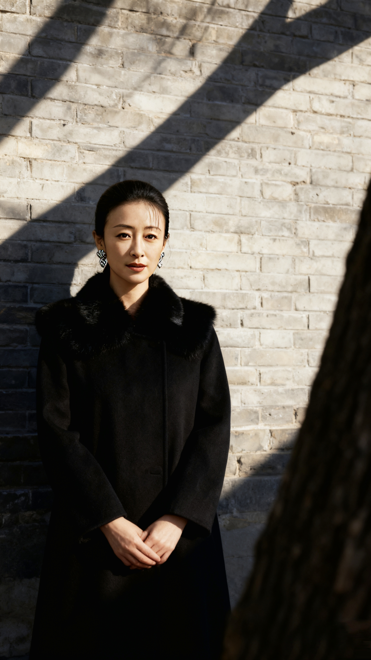 雙手交疊的動作,是中式禮儀里的端莊,也是內(nèi)心的篤定。指尖相扣,腕骨輕露,這個姿勢沒有刻意的擺拍感,只是自然的流露,像老北京女子的優(yōu)雅刻在骨子里,無需刻意展現(xiàn),便自成風(fēng)骨。她的身姿挺拔,肩頸的線條舒展,即便身著厚重的大衣,也沒有絲毫的臃腫感,這份體態(tài)的優(yōu)雅,是歲月與修養(yǎng)共同賦予的。