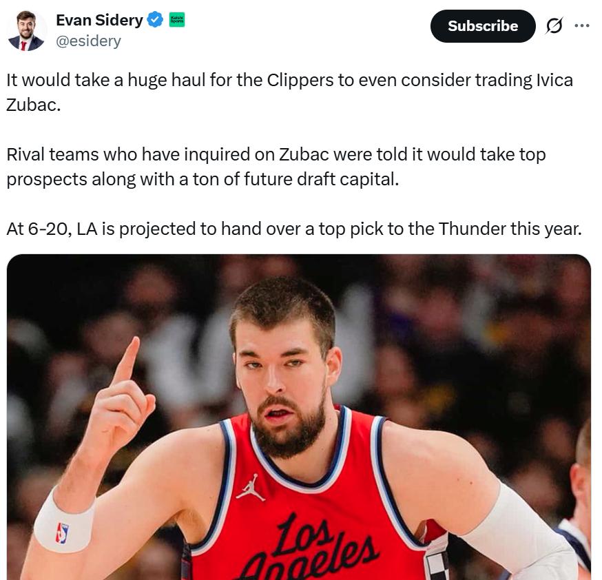 祖巴茨幾乎成為快船隊想要大改陣容唯一能動的球員,快船隊記Iliyan Lakhani直言交易祖巴茨是快船隊目前唯一的救命稻草,也是重建唯一的希望。