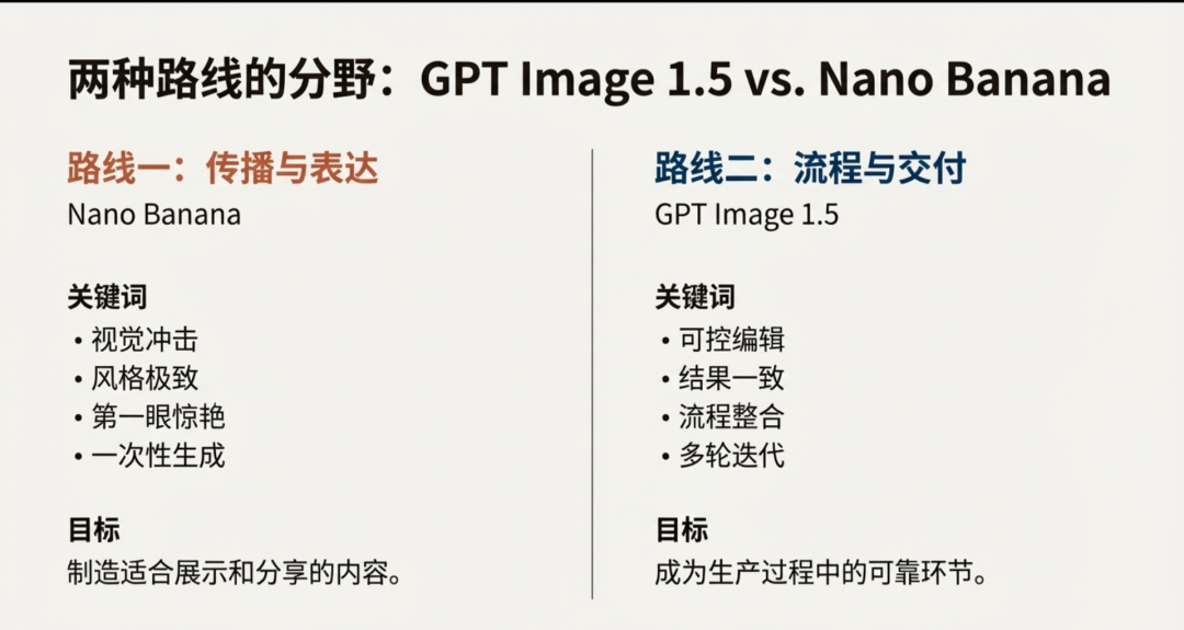 從這個角度看,GPT Image 1.5 與 Nano Banana 并非簡單的競爭關系,而是代表了 AI 圖像生成的兩種方向:一種偏向傳播和表達,一種偏向流程和交付。