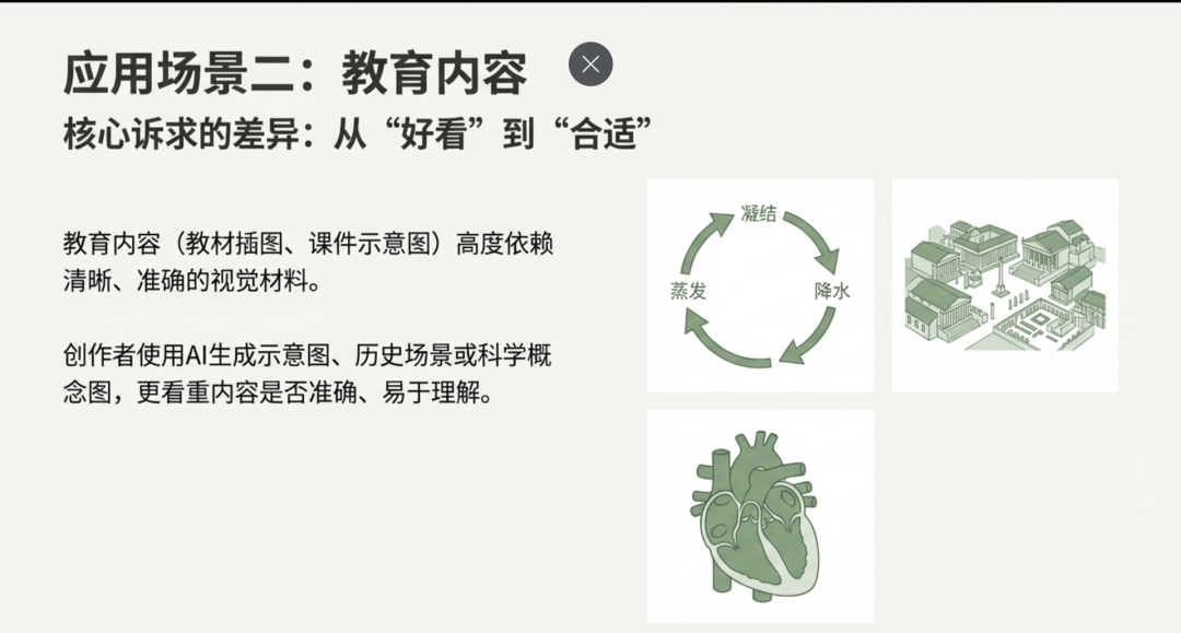 教育內容長期高度依賴視覺材料。無論是教材插圖、課件示意,還是在線課程中的輔助畫面,都需要清晰、準確且易于理解。與商業創意不同,教育對視覺效果的要求并不在于「好看」,而在于「合適」。