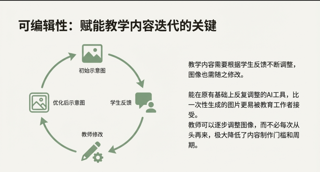 在這一過程中,可編輯性變得尤為重要。教學內容往往需要根據學生反饋進行調整,圖像也需要隨之修改。相比一次性生成的圖片,能夠在原有基礎上反復調整的 AI 工具,更容易被教育工作者接受。
