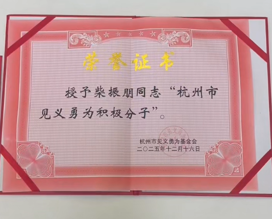 12月16日下午,杭州市見義勇為基金會向柴振朋授予了“杭州市見義勇為積極分子”稱號,并給他頒發(fā)10000元獎金。在頒獎現(xiàn)場,他說,這筆錢想轉(zhuǎn)給老家的爸媽,兩人都在老家務(wù)工,挺不容易的。“希望大家遇到這些事兒的時候,都能挺身而出吧。”