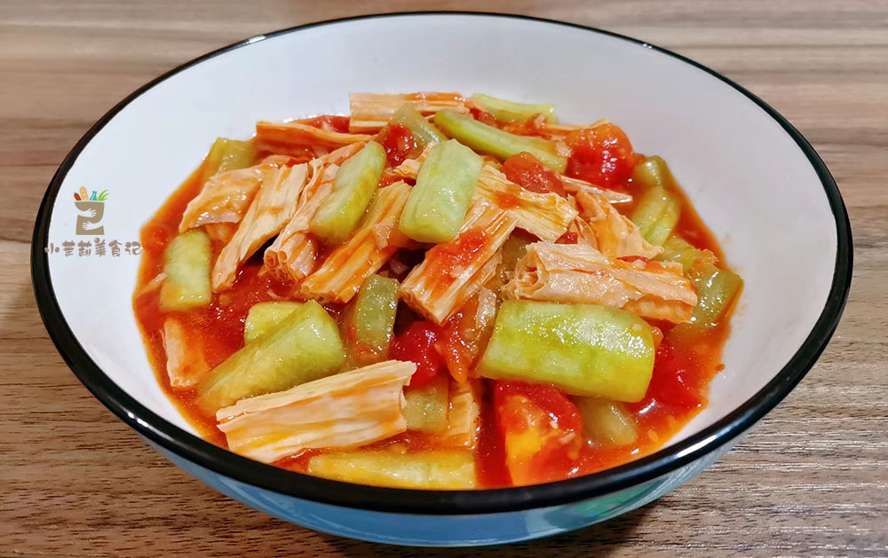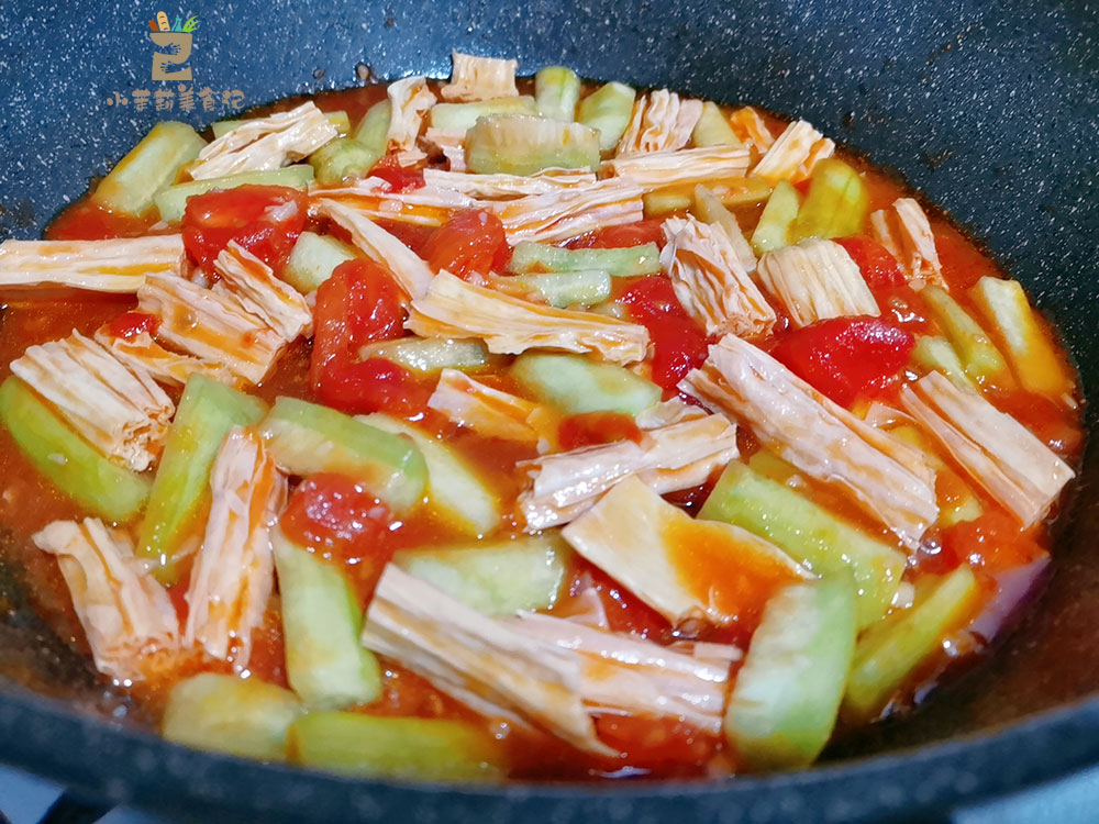 3、鍋里放油,蒜蓉,小番茄在里邊炒出味道來,調入生抽,蠔油,補點熱水或高湯,絲瓜腐竹都下鍋,咕嘟五分鐘,撒點鹽即可出鍋。