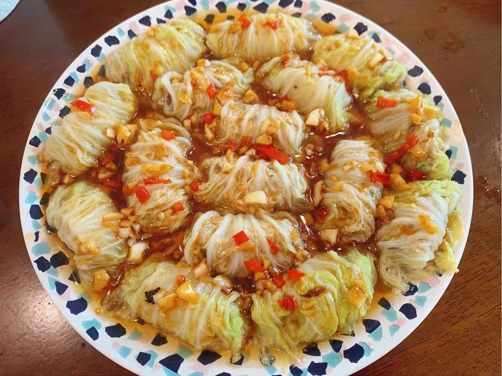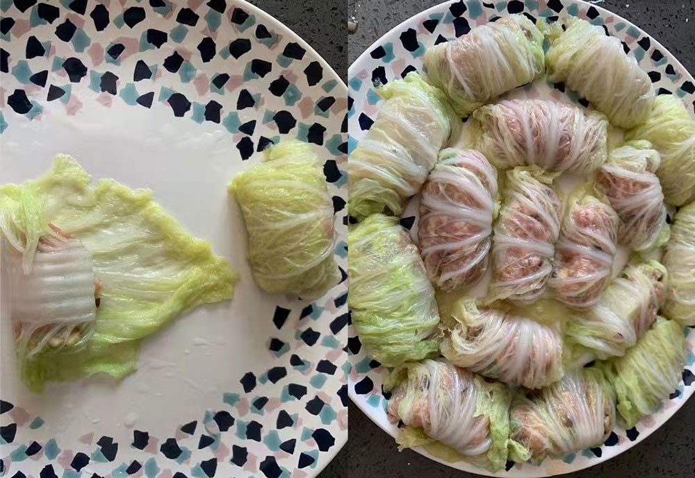 4、以白菜為皮,包入餡料,輕輕裹起來,擺在盤子里。端上蒸鍋,二十分鐘左右,確保肉餡熟透再關火。