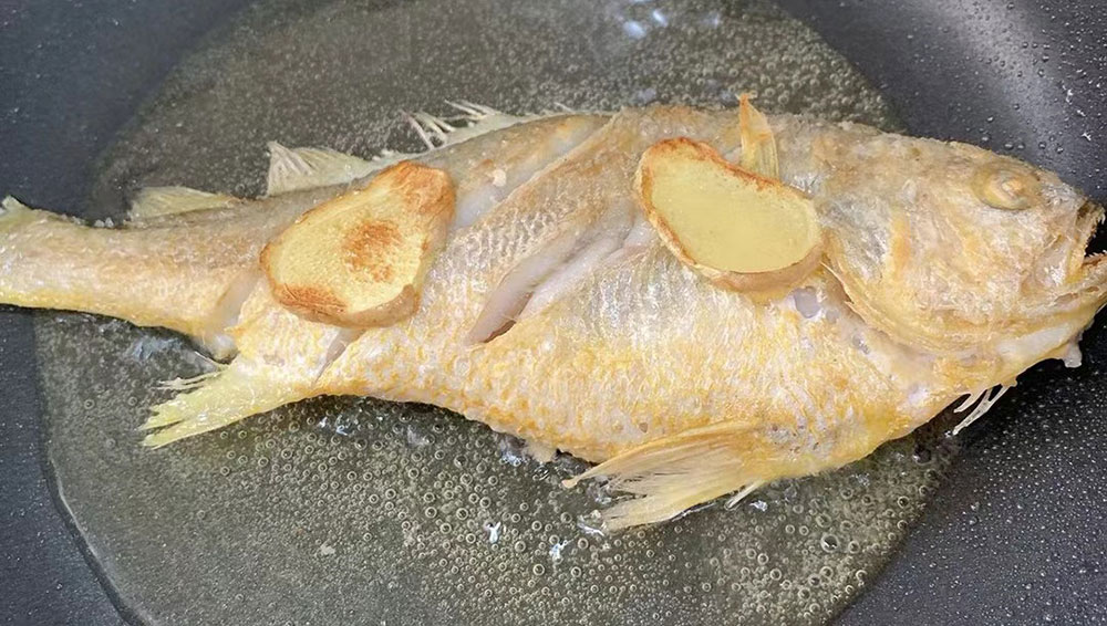 3、鍋里放油,先丟幾片生姜在里邊,邊加熱邊把生姜的香味烹出來,魚輕輕放進去,中大火加熱,一兩分鐘翻一次,確保受熱均勻。表面都成型后,蓋住燜十分鐘,令內部的肉質熟透。