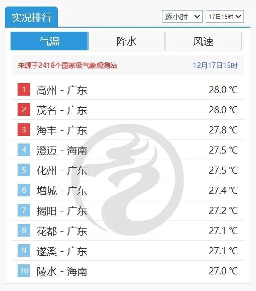 然而,不止深圳,今天(12月17日)15時前后,廣東各地的氣溫紛紛“稱霸”全國榜單前十名!