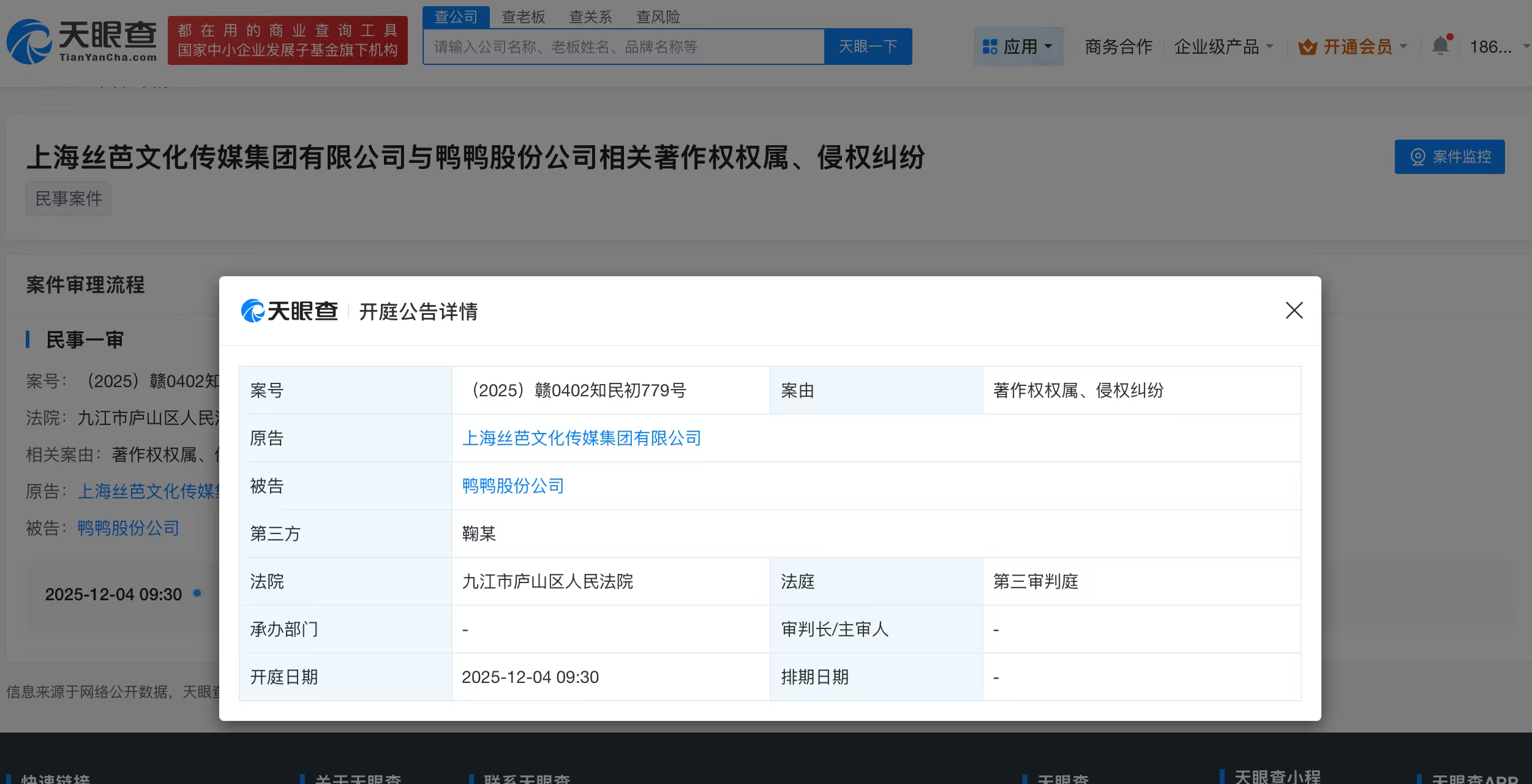 天眼查天眼風險信息顯示,此前,上海絲芭文化傳媒集團有限公司與鴨鴨股份公司相關著作權權屬、侵權糾紛案件開庭公告顯示,該案原告為上海絲芭文化傳媒集團有限公司,第三人為鞠婧祎,該案開庭日期為2025年12月4日,審理法院為九江市廬山區人民法院。據悉,2024年10月,鞠婧祎官宣正式成為鴨鴨品牌代言人。