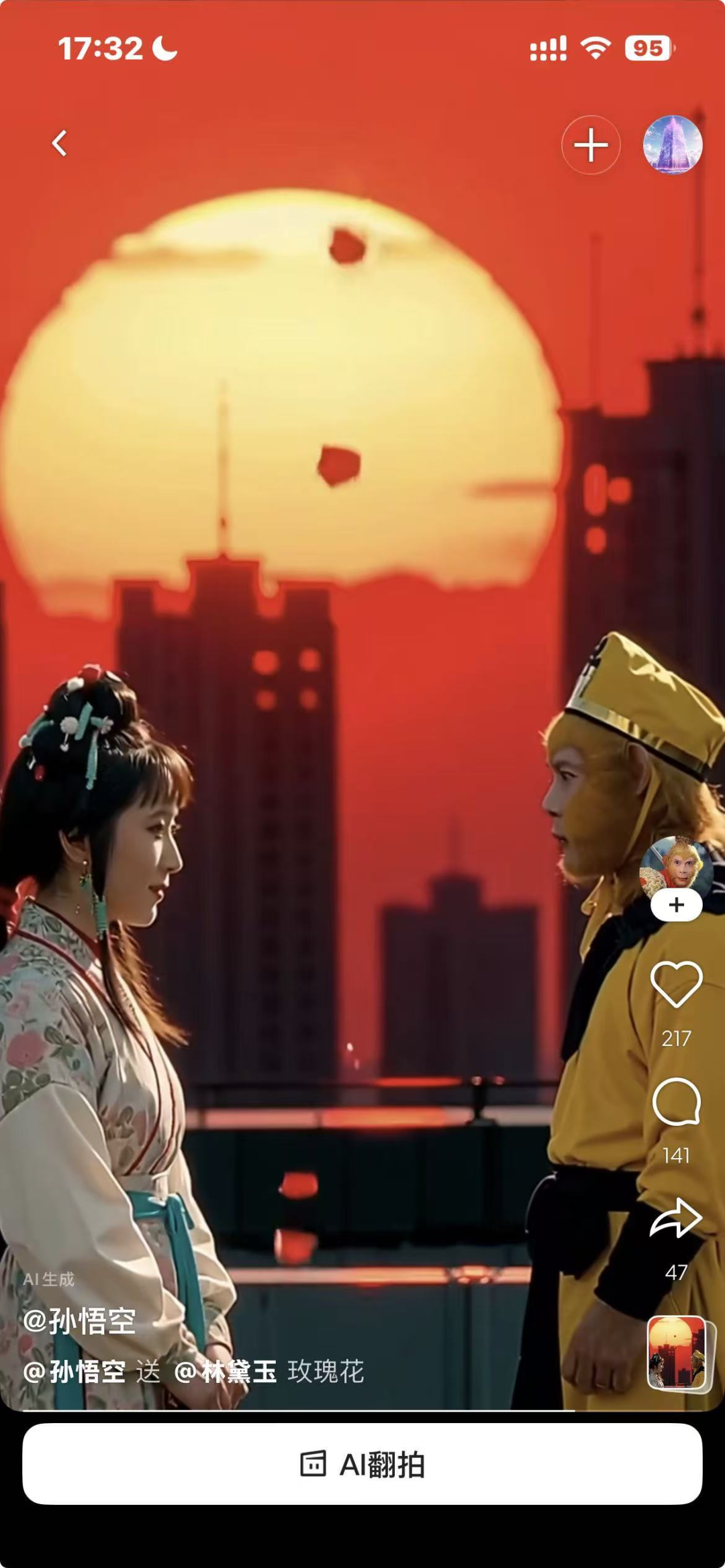 比如,悟空可以和黛玉告白。我們用“AI翻拍”功能翻拍了一位創(chuàng)作者的原創(chuàng)視頻。