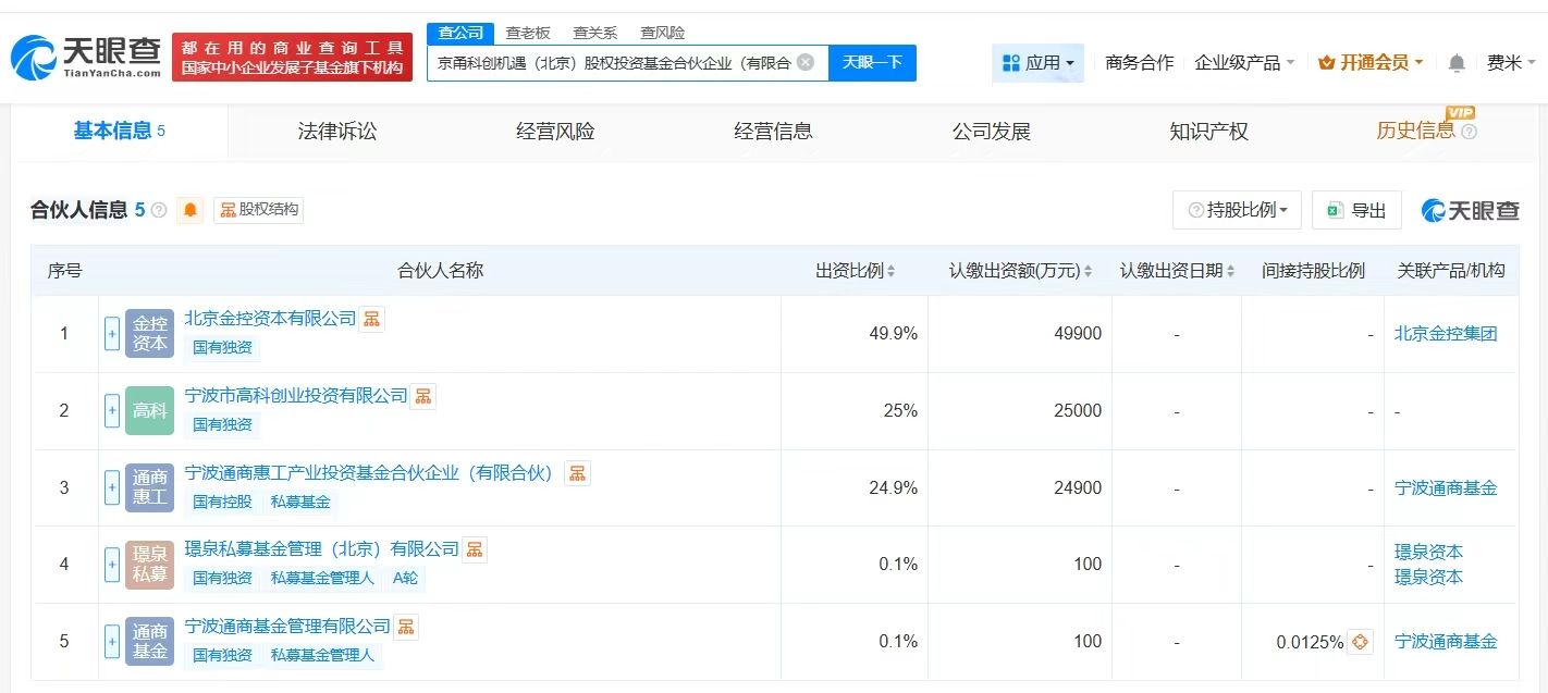 天眼查App顯示,近日,京甬科創機遇(北京)股權投資基金合伙企業(有限合伙)成立,執行事務合伙人為寧波通商基金管理有限公司、璟泉私募基金管理(北京)有限公司,出資額10億人民幣,經營范圍為私募股權投資基金管理、創業投資基金管理服務,由北京金控資本有限公司、寧波市高科創業投資有限公司、寧波通商基金管理有限公司等共同出資。