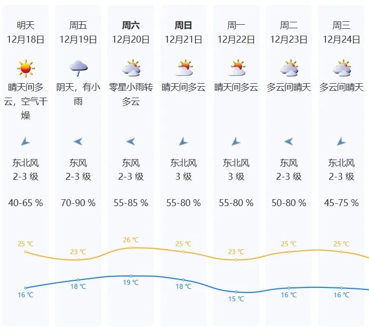 12月18日,深圳將延續(xù)晴天到多云的好天氣。白天溫暖舒適,早晚雖有清涼,但整體氣溫呈回升趨勢(shì),是近期最適宜洗曬的時(shí)段。