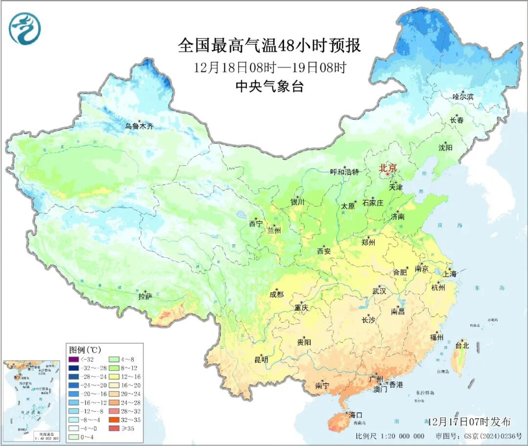 12月18日,隨著升溫范圍迅速擴(kuò)大,最高氣溫10℃線將明顯北抬,甘肅南部、陜西大部、江蘇、安徽、河南等地暖意顯現(xiàn),最高氣溫將升至10℃以上。