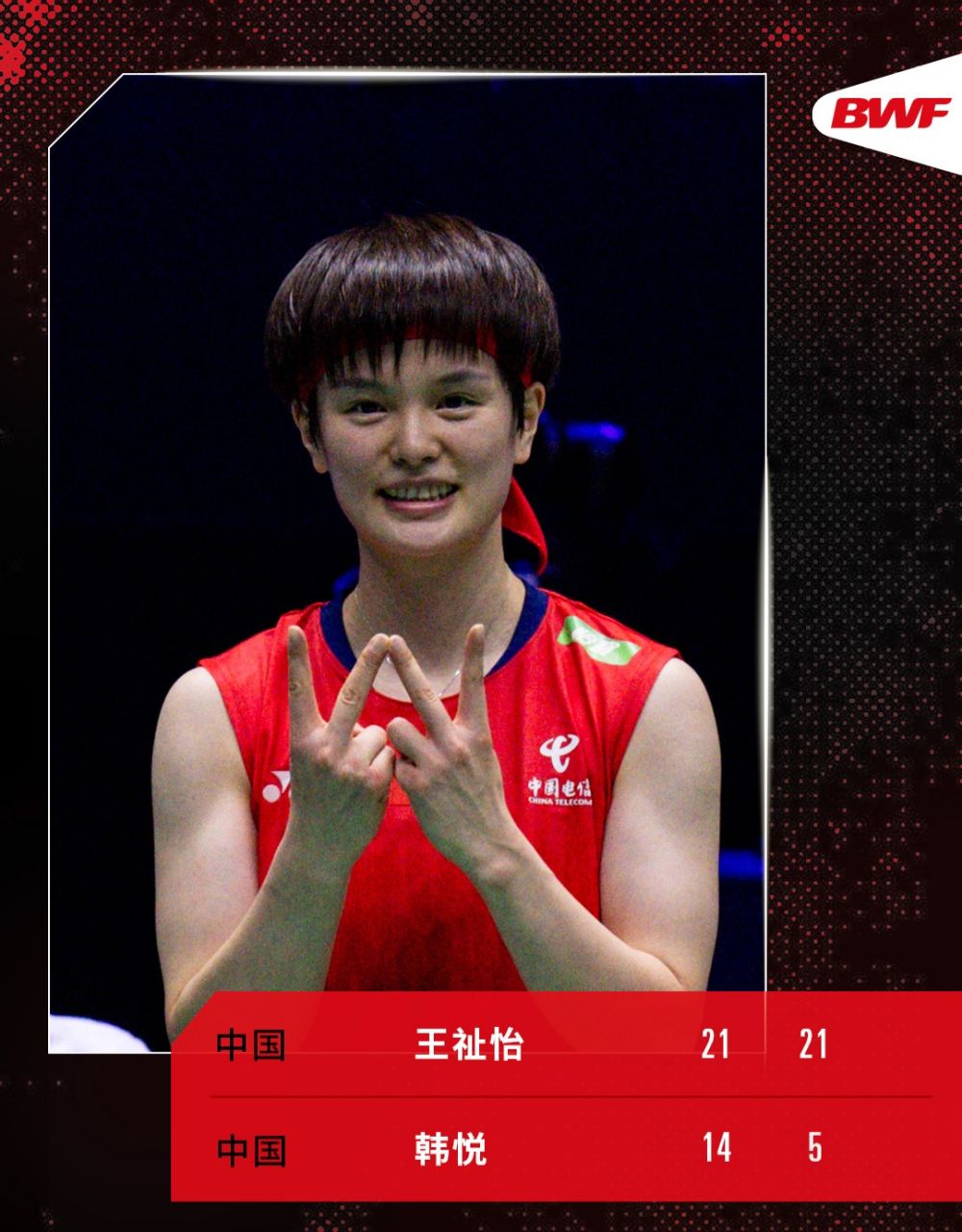女單四場對決中,三場是隊友間的比拼。王祉怡迎戰上屆亞軍韓悅,以21:14和21:5輕松取勝。“彼此很熟悉,所以在心態和多拍方面,需要做更多準備。”王祉怡說。