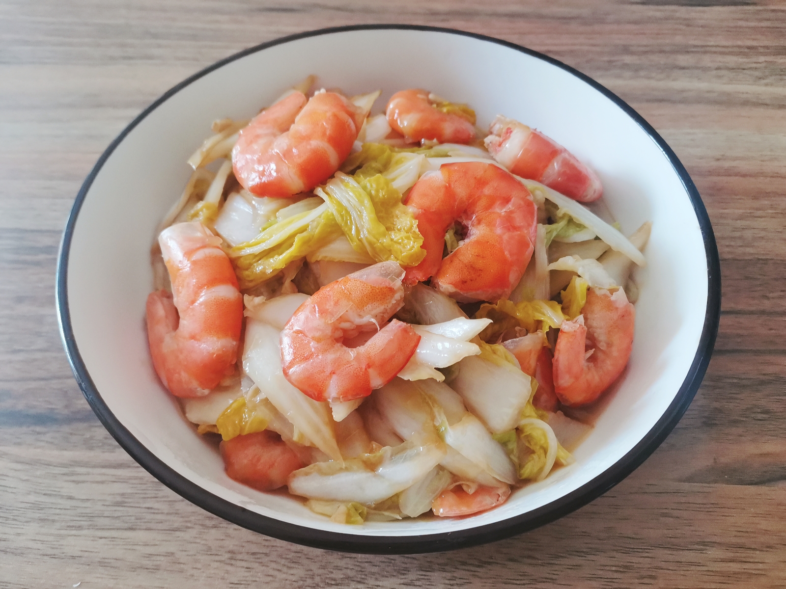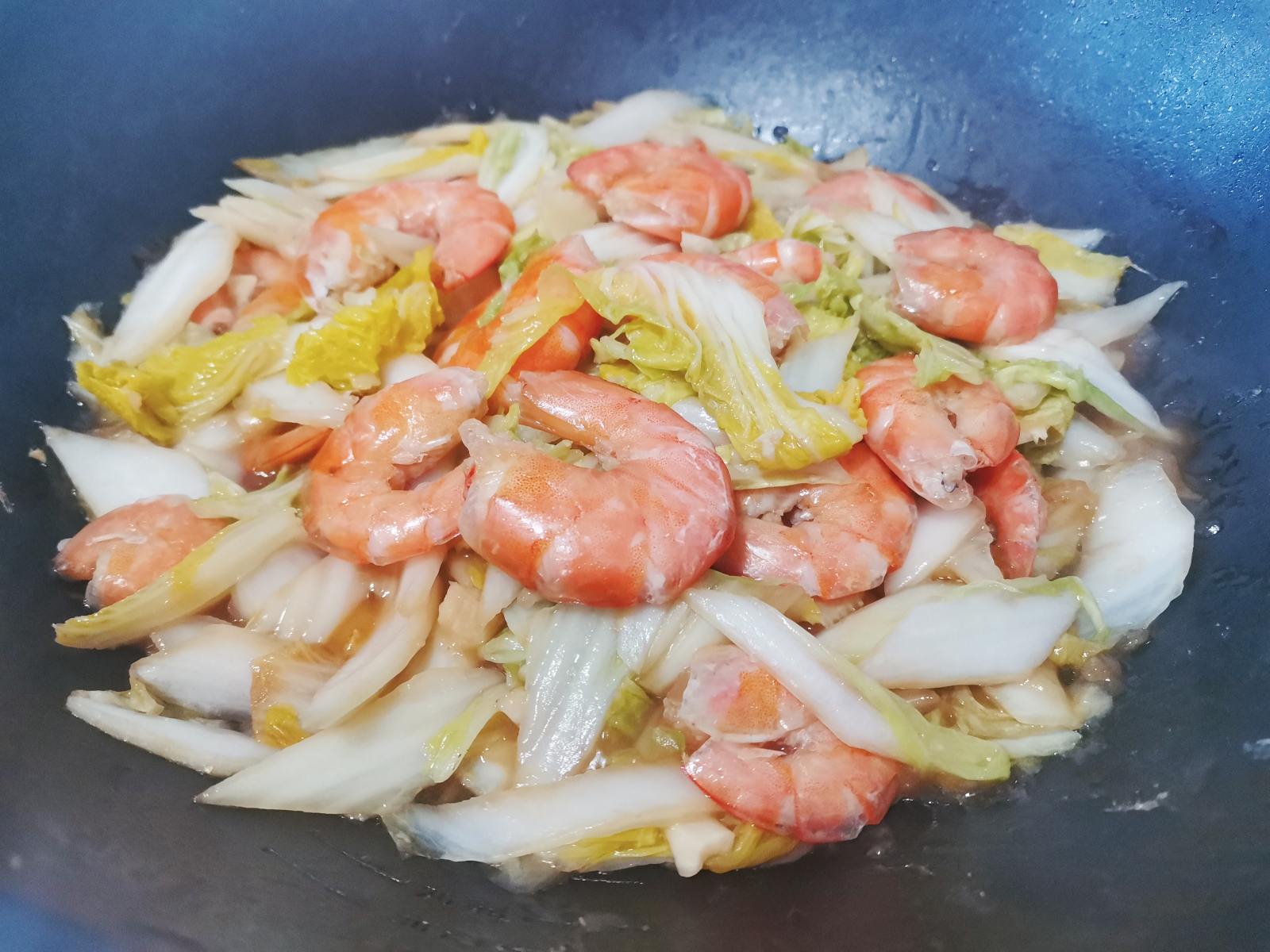 4、白菜塌生后,蝦重新倒回去,調些生抽,蠔油,一點點鹽,翻炒勻了,淋一點水淀粉,這樣吃起來更入味。