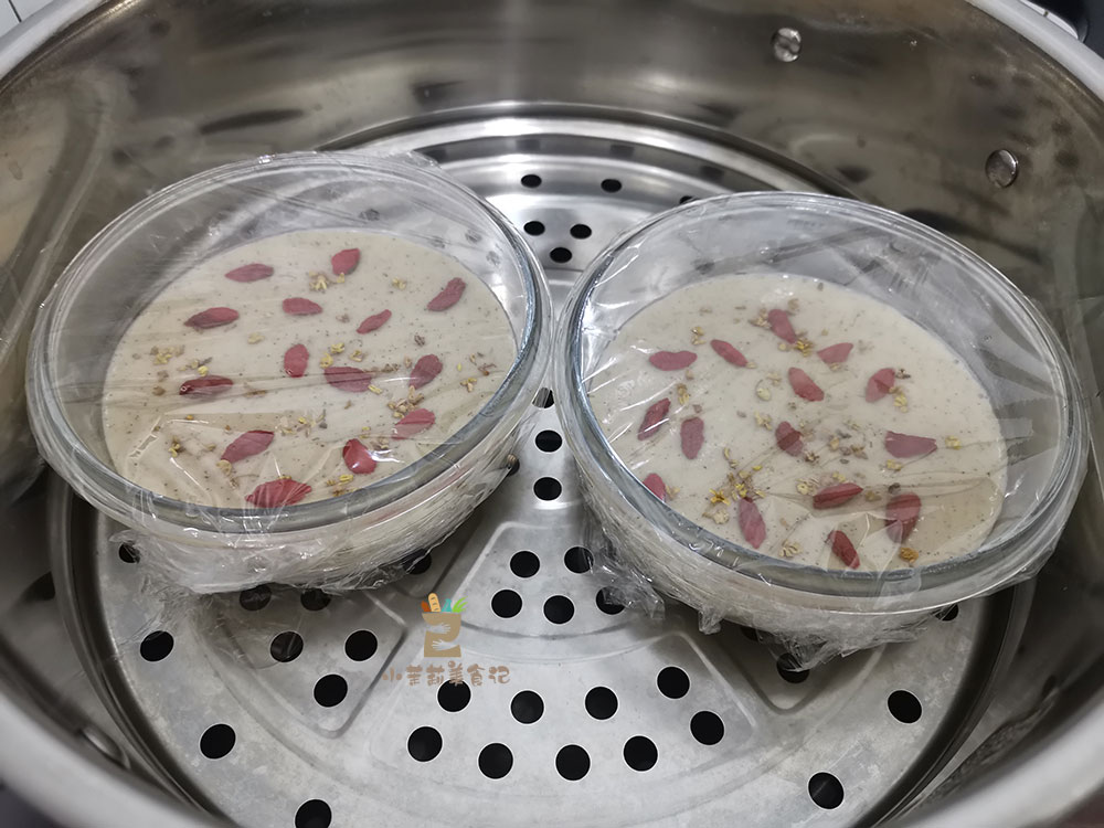 3、再往里邊加點泡打粉,混合半混后。在碗底鋪上吸油紙,糊倒進去,表面點綴桂花和紅枸杞。