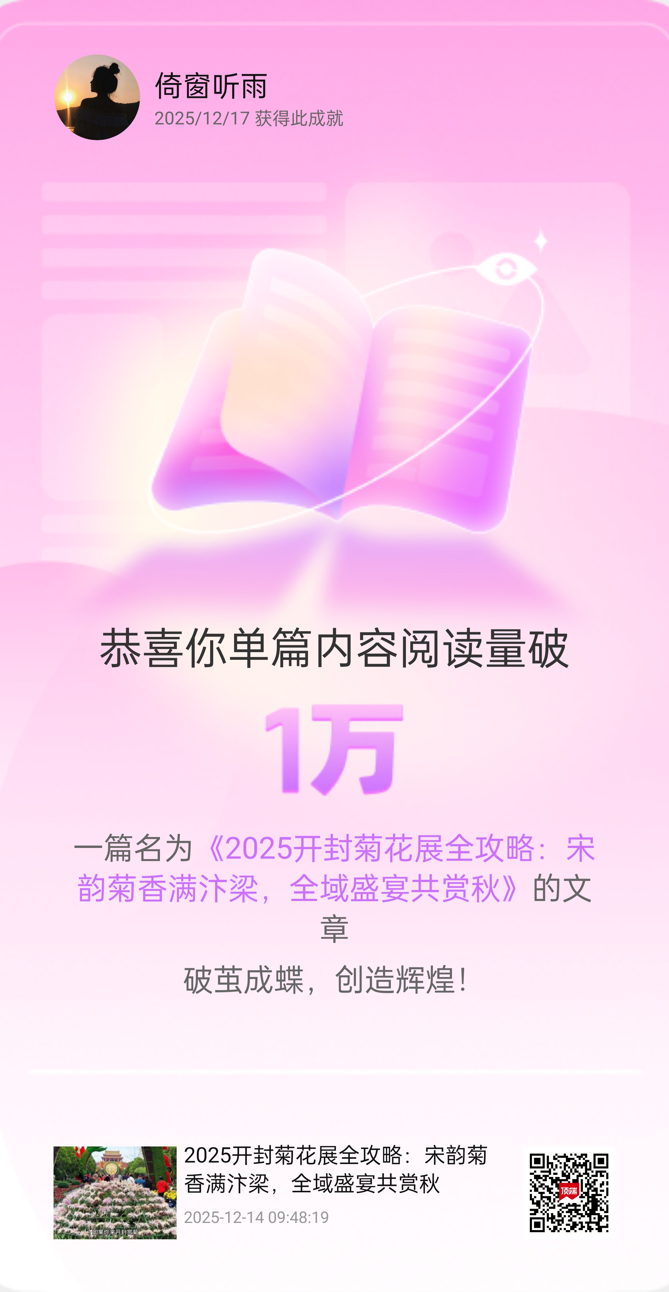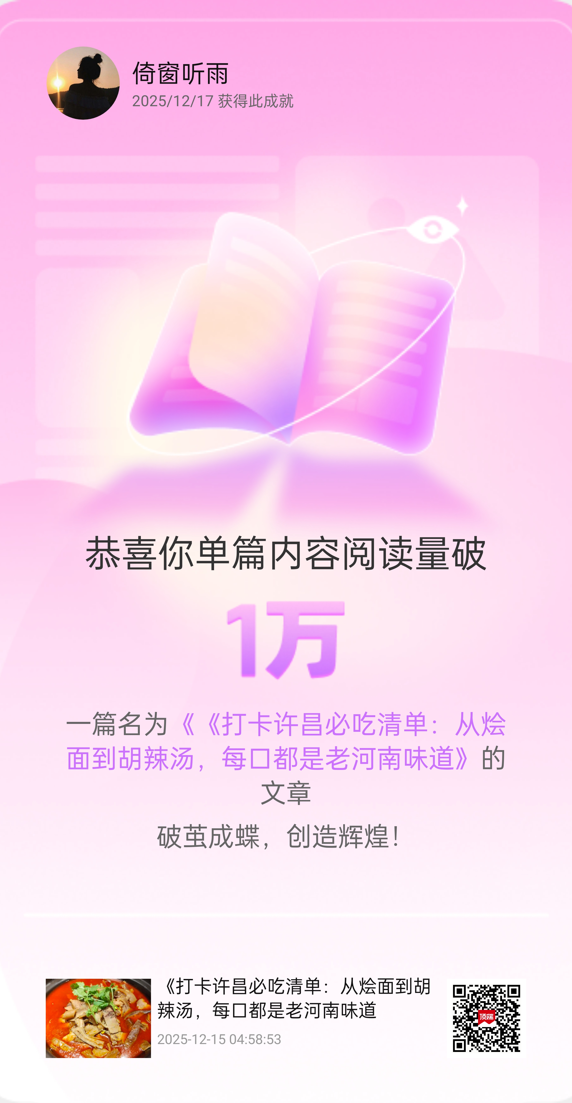 今天打開后臺,看到7篇文章接連跳出“閱讀量破萬”的提示,粉紫色的成就卡片像一串小煙花,在屏幕上亮得晃眼——原來這幾天敲下的字,已經跟著平臺的推薦,悄悄鉆進了這么多人的視線里。