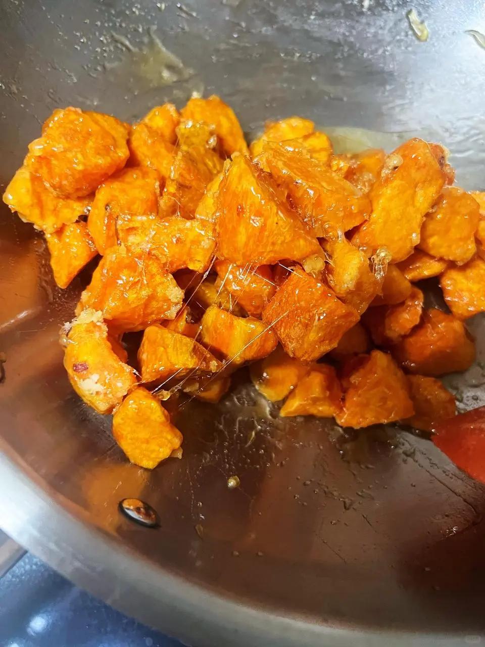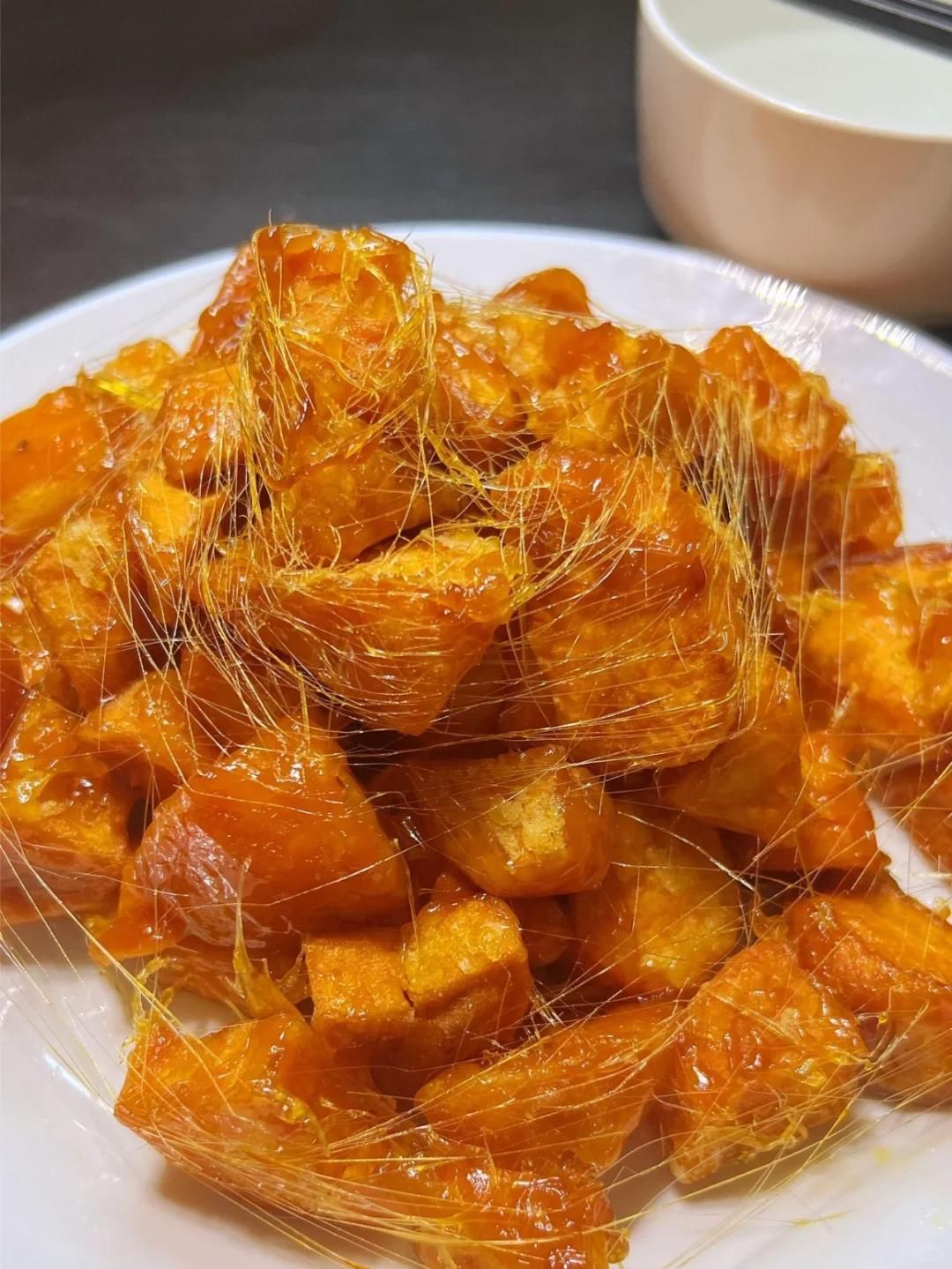 關火后盛出來,趁熱吃的時候能拉出長長的糖絲,外酥里嫩,甜而不膩,大人孩子都搶著吃。