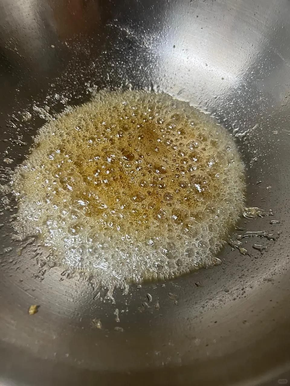 鍋里留少許底油,放入適量白糖,小火慢慢翻炒,直到白糖融化,變成琥珀色的糖漿,這時候要不停攪拌,防止糖漿糊鍋。