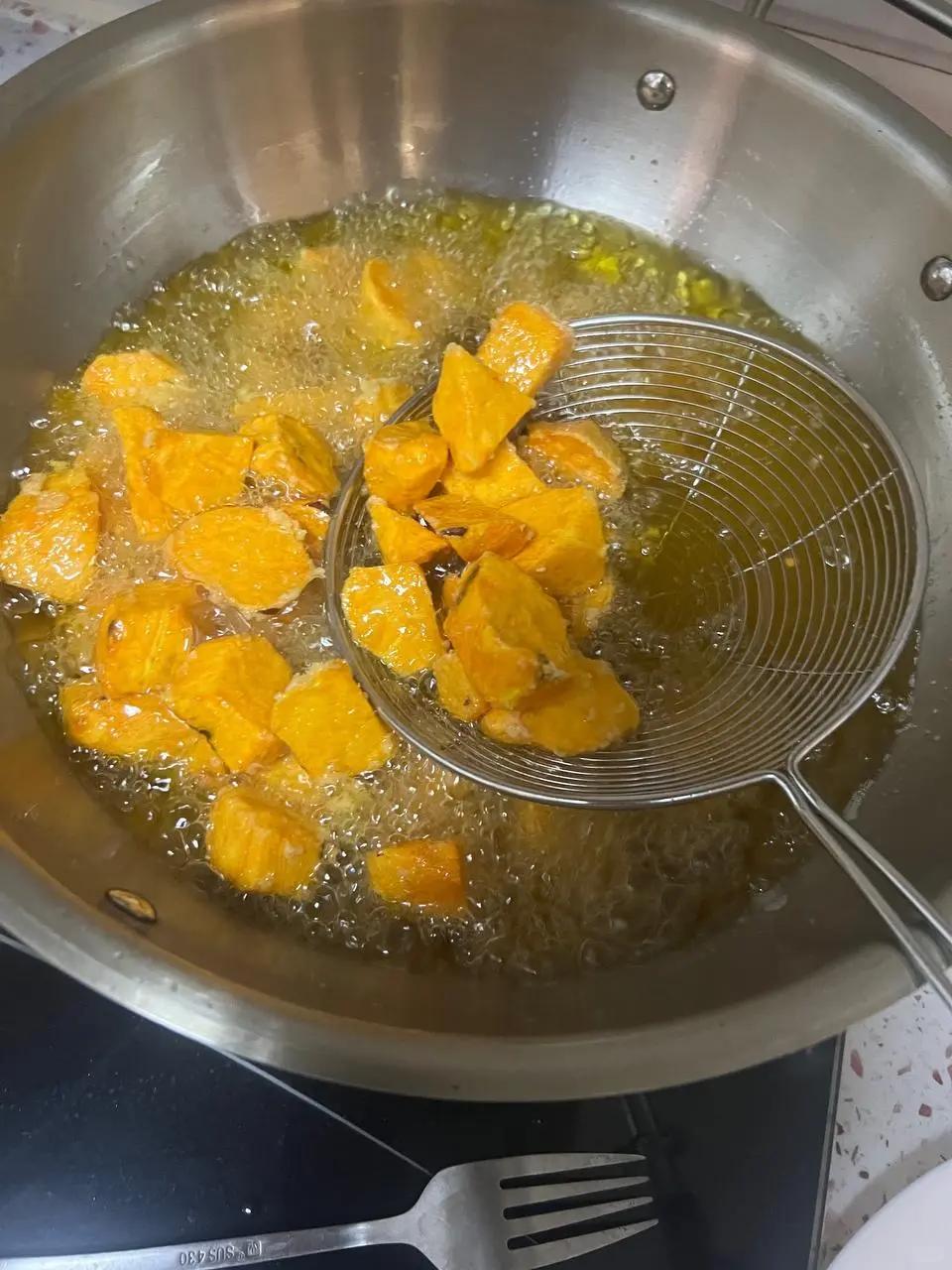 鍋里放適量食用油,油燒至六成熱,把紅薯塊放進去,中小火慢炸,炸到紅薯塊表面金黃酥脆,用筷子能輕松扎透,就撈出來控油。