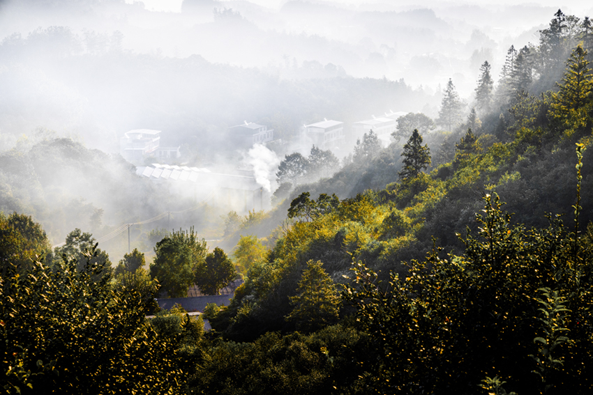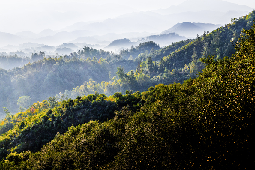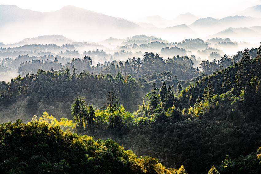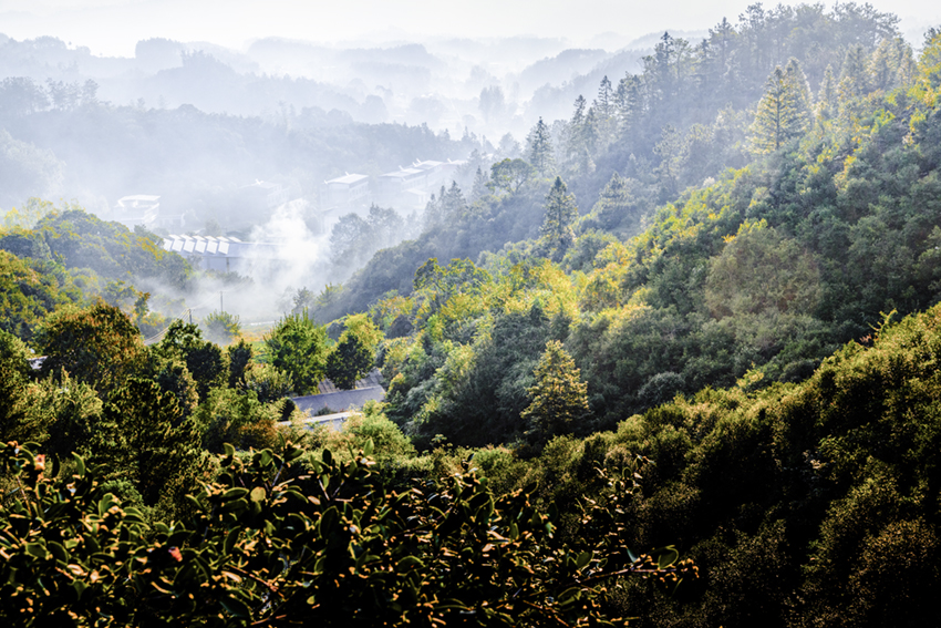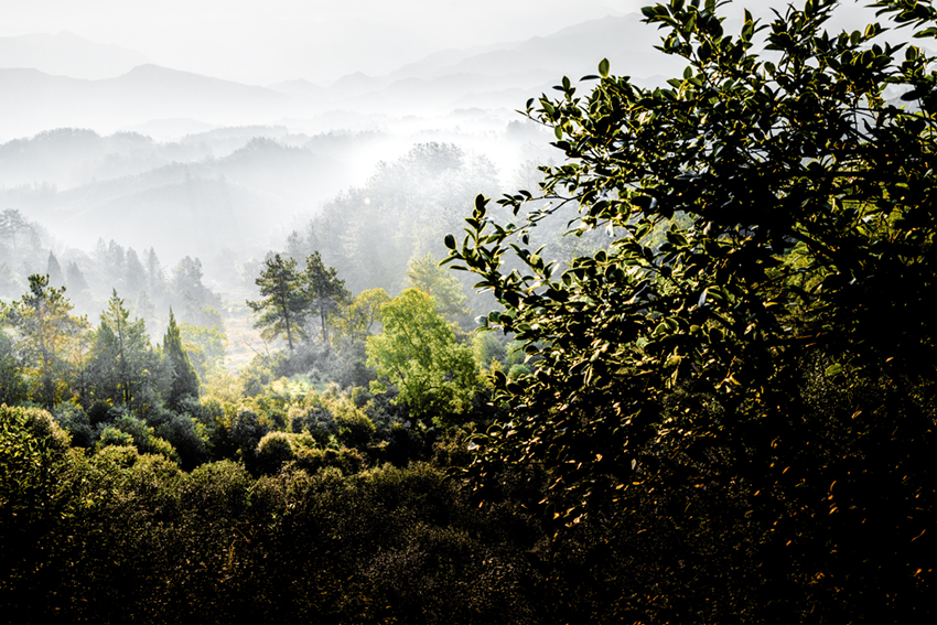 霧漫層林峰隱現(xiàn),光穿翠谷韻悠然。