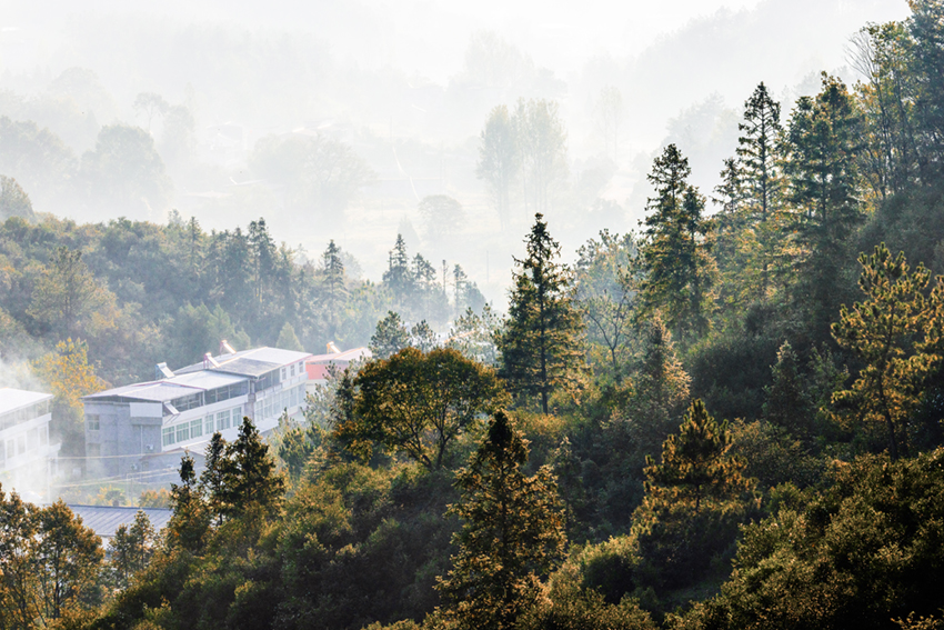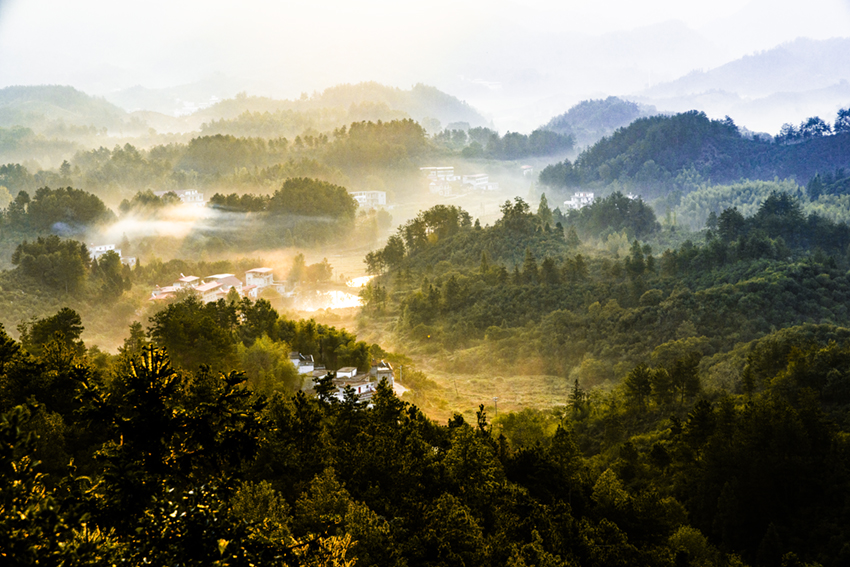晨霧輕籠山舍處,金光漫灑翠林間。