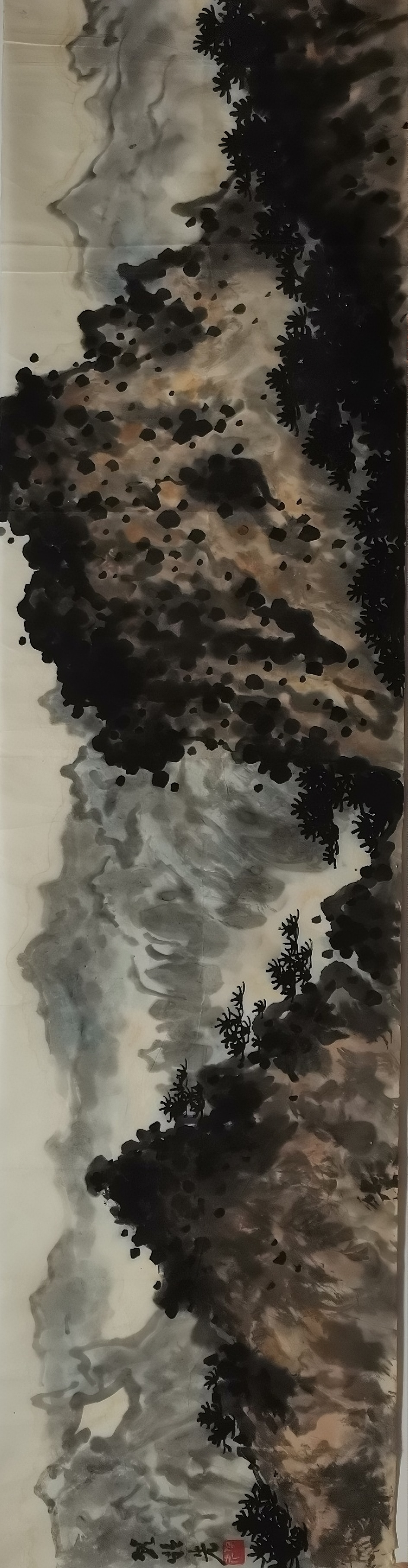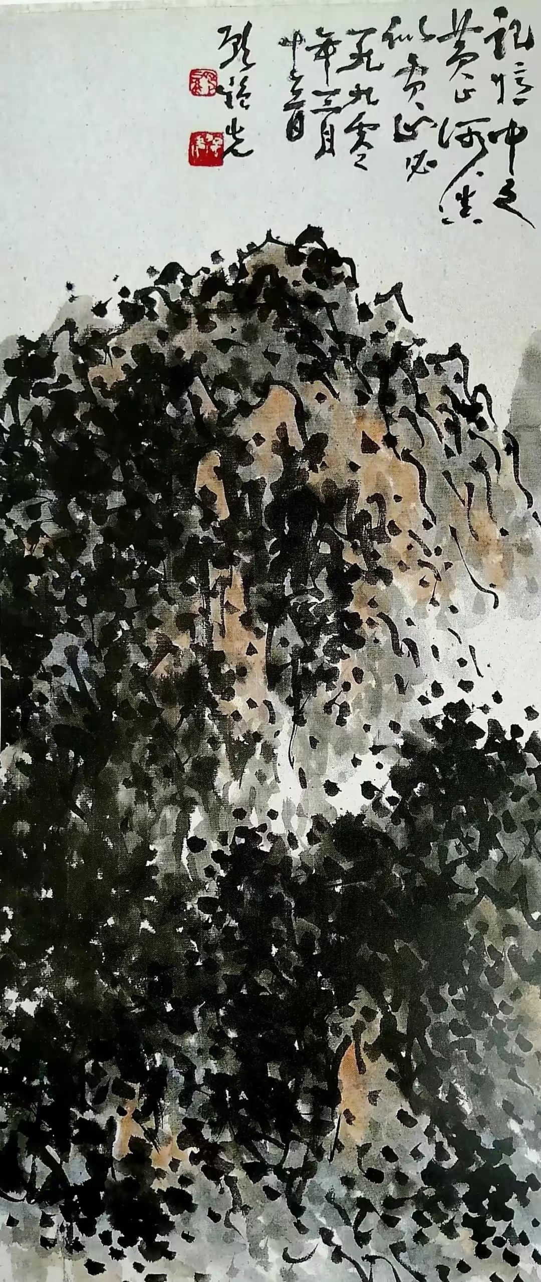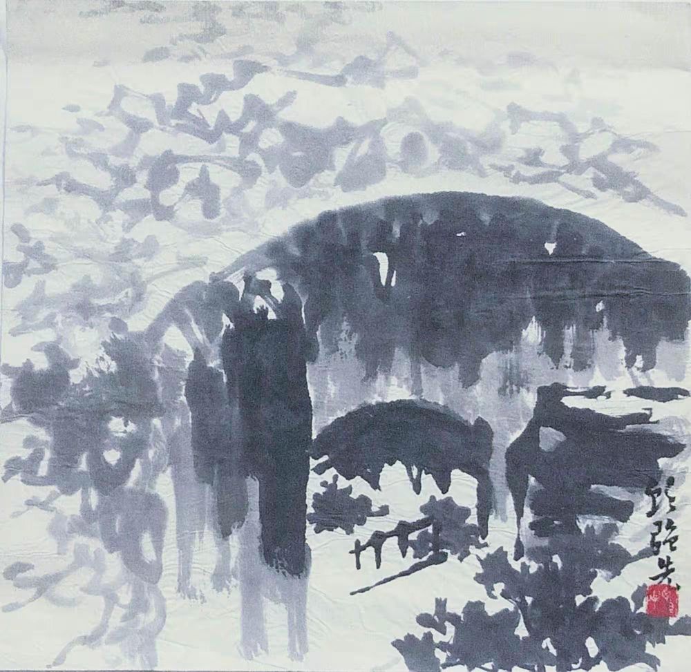 明代畫家董其昌在《畫禪室隨筆》中主張「墨氣淋漓,煙嵐?jié)M紙」,強(qiáng)調(diào)墨色的流動(dòng)感與整體氣韻。顧強(qiáng)先先生晚年題畫句「黑團(tuán)團(tuán),墨團(tuán)團(tuán),黑墨團(tuán)中天地寬」,正是對(duì)這一主張的昇華與創(chuàng)新。董其昌追求的是文人畫的清雅墨韻,而先生則在雄厚沉著的基礎(chǔ)上,追求墨色的內(nèi)在空間感——《墨竹圖》中看似濃密的墨團(tuán),卻通過乾濕變化分出層次,竹葉間的留白與濃墨形成對(duì)比,營(yíng)造出「天地寬」的意境,這與董其昌「以少勝多,以簡(jiǎn)馭繁」的藝術(shù)理念相通。先生認(rèn)為「信筆亂塗較之刻意求工大有生意,然而隨意仍植根於有意耳」,這種「隨意而不任性」的筆墨實(shí)踐,與董其昌「率意天真而不失法度」的主張一致,使筆墨在規(guī)矩與自由之間達(dá)到平衡,最終實(shí)現(xiàn)「墨氣淋漓而不浮滑,雄厚沉著而不板滯」的藝術(shù)境界。