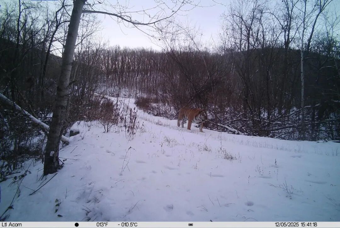 近日,被成功救助放歸的野生東北虎“完達山1號”,再度在黑龍江省東寧市區域現身。