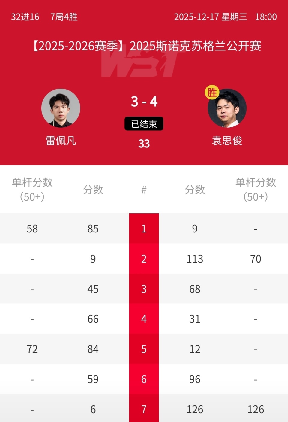 這場比賽,吳宜澤實力碾壓,他在比賽中轟出一桿破百和兩桿50+,直落4局以總比分4-0橫掃藍裕豪,強勢晉級16強,他也是第一位晉級16的球員!