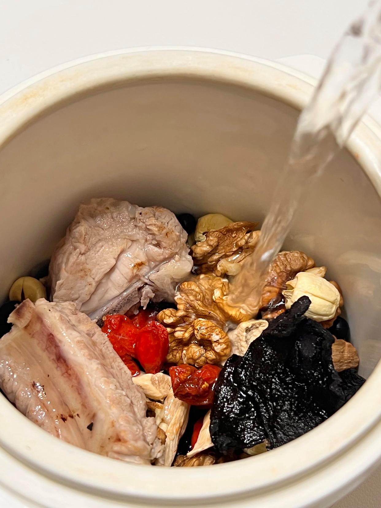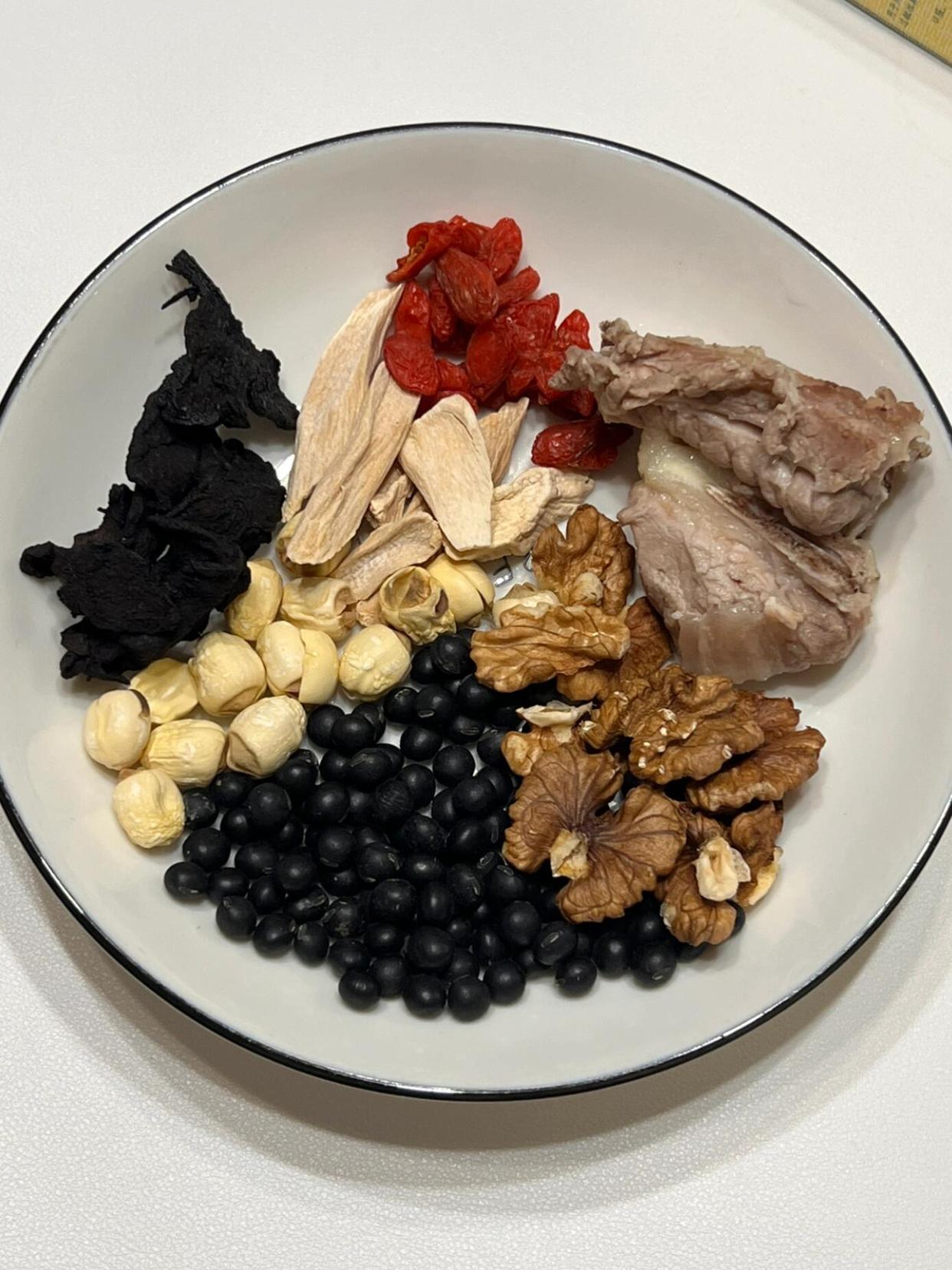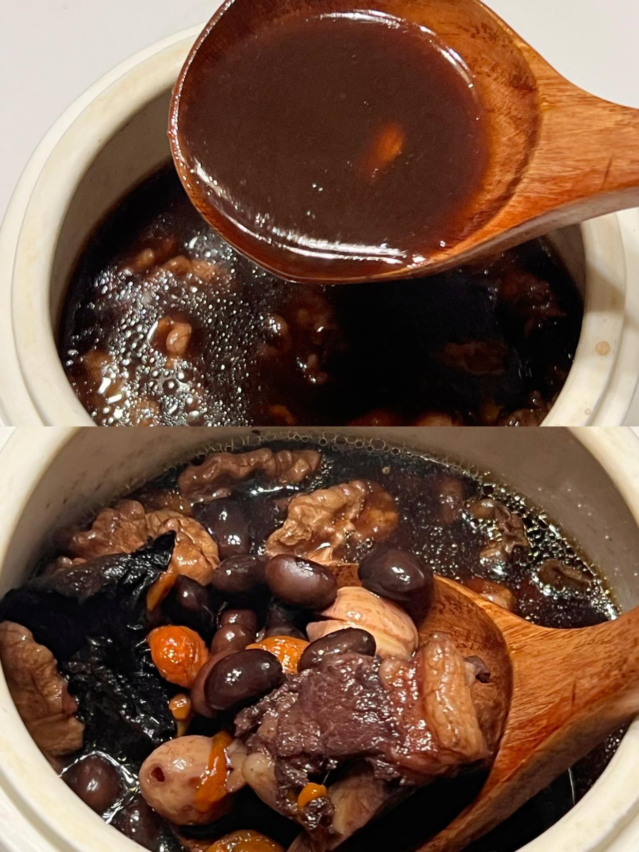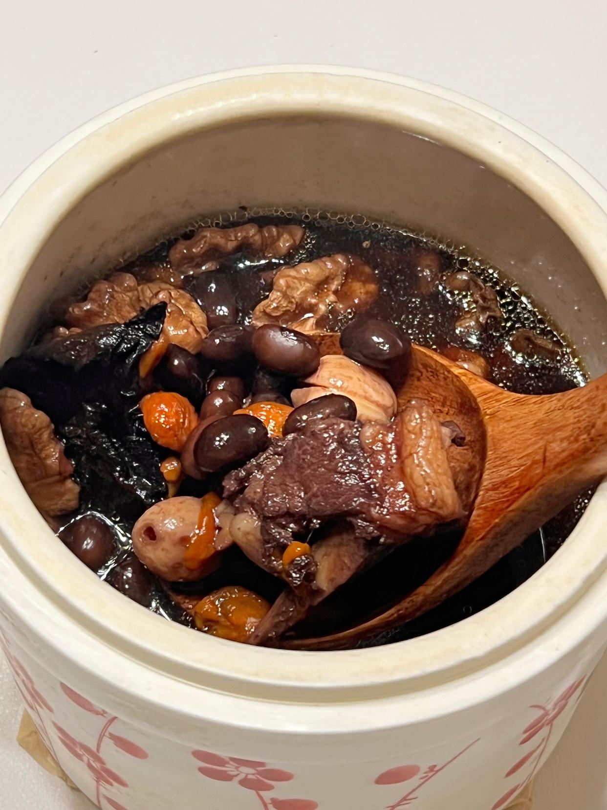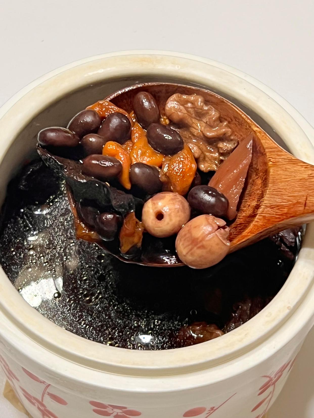 這道湯食材搭配更豐富,補腎效果也更突出,適合想給身體“打根基”的朋友。做法也不復雜:豬扇骨300克焯水去血沫,黑豆提前浸泡4小時,和核桃仁、干山藥片、蓮子、3-4片黃精、一起放進砂鍋;加足量清水,大火燒開后轉小火慢燉2小時,讓食材的營養充分融入湯里。燉好的湯帶著淡淡的陳皮香,解膩又提鮮,黑豆軟糯、核桃香脆,豬骨軟爛脫骨。我爸媽喝了大半年,現在臉色紅潤有光澤,走路腰桿也挺直了,逢人就說“閨女煲的湯比啥都補”。