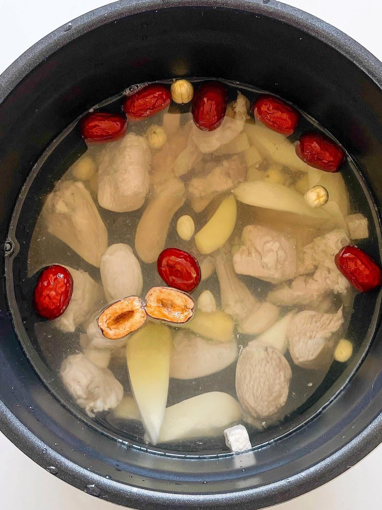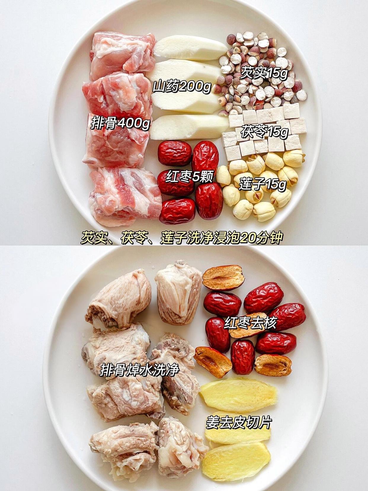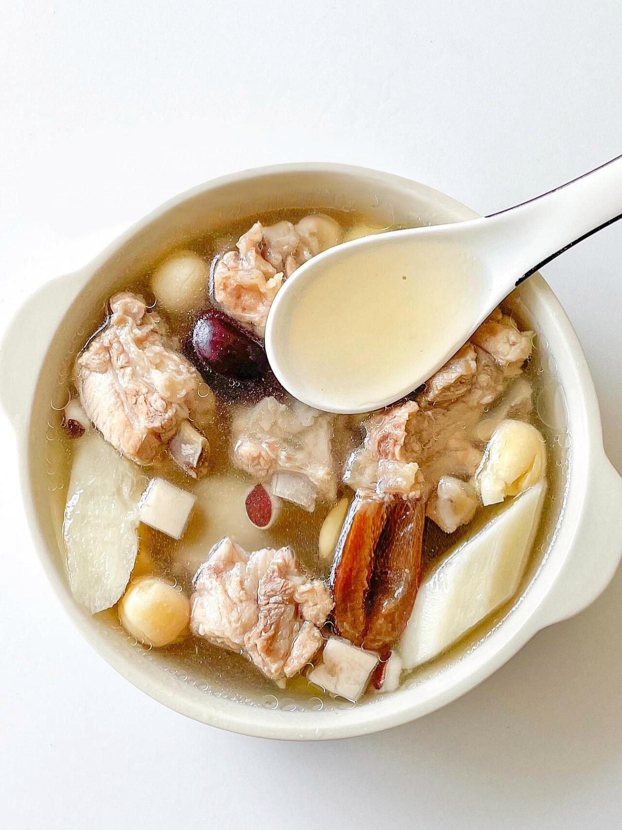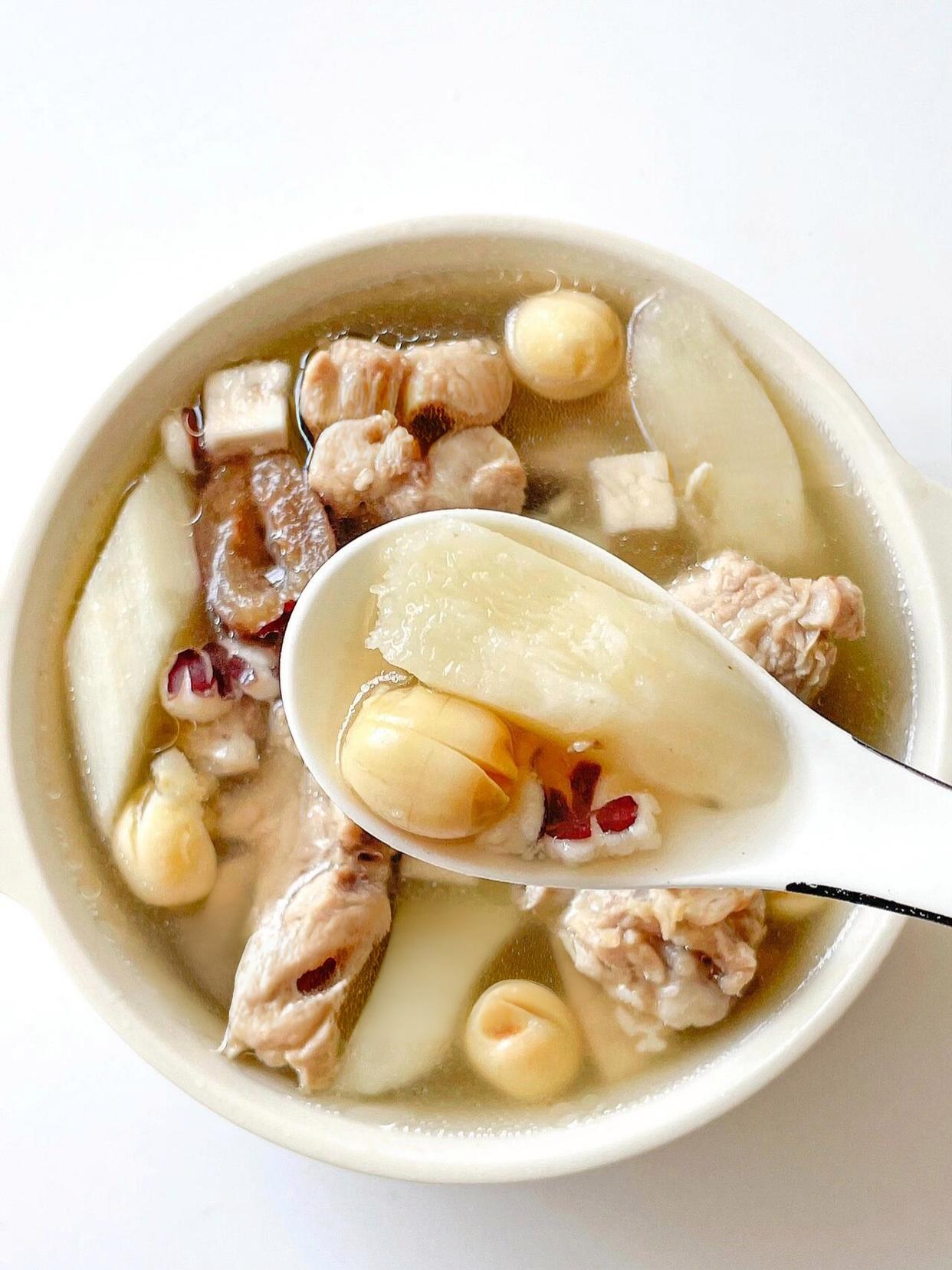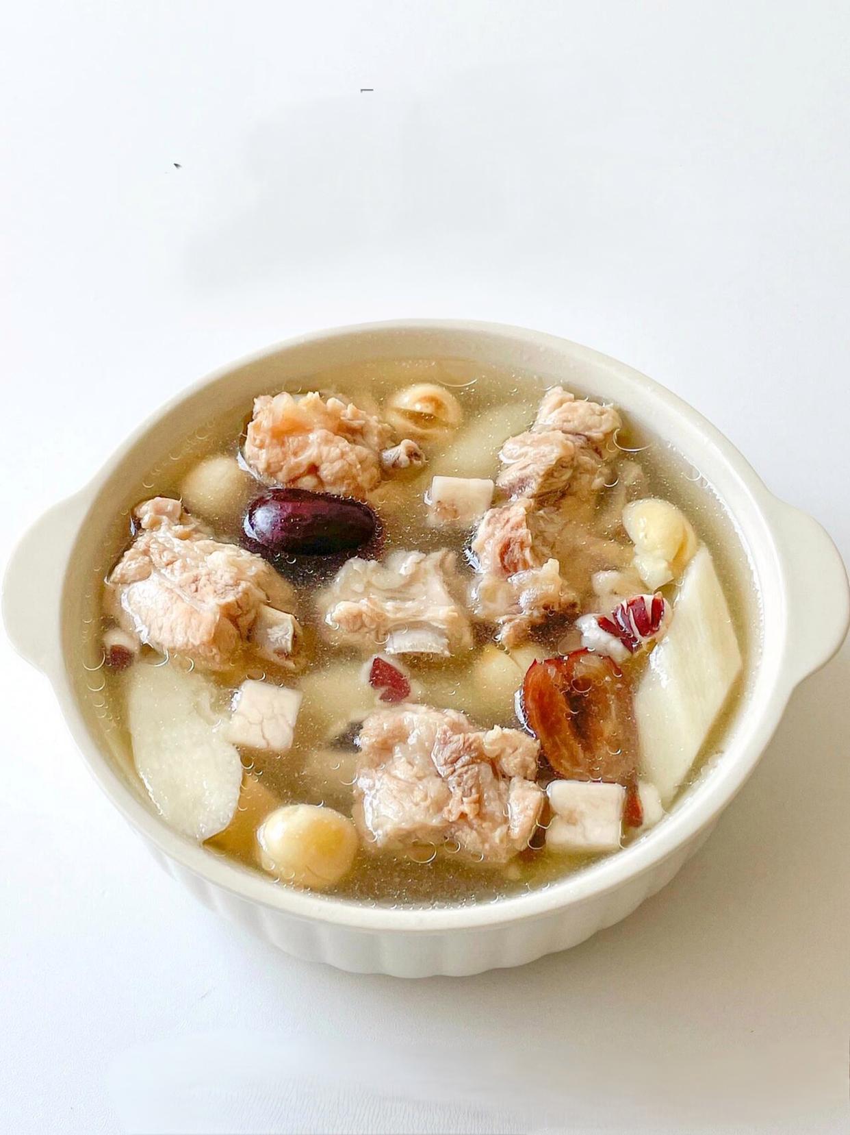 第二道是全家都愛的平和養護湯——山藥芡實茯苓蓮子排骨湯!這道湯不溫不燥,健脾又補腎,特別適合脾胃虛弱、容易疲勞的人。食材都是常見的養生好物:排骨250克焯水,干山藥片(或新鮮鐵棍山藥)、芡實、茯苓、蓮子各10克,薏米一小把(體質偏寒可省略),一起放進電飯煲;加清水沒過食材,按“煲湯模式”煮1小時,出鍋前加鹽調味。湯喝起來清甜溫潤,排骨軟爛入味,山藥和蓮子煮得軟糯,入口即化。我老公現在每周喝兩次,說上班久坐再也不覺得腰沉了,下班回家還有精力陪孩子玩,連睡眠質量都好了很多。