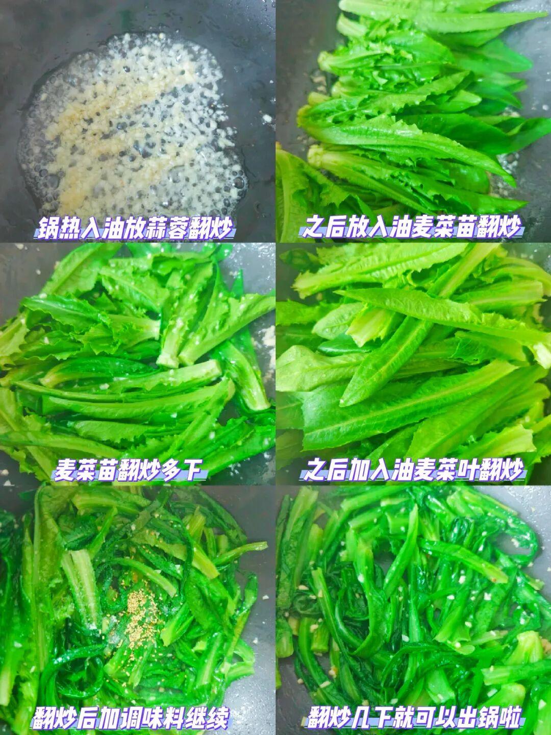 3??、麥菜苗翻炒多下,之后加入油麥菜葉翻炒,翻炒后加調味料繼續幾下就可以出鍋啦。