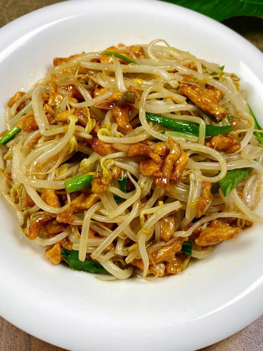 2??、豆芽洗干凈,鍋里油熱下鍋炒熟,倒入豆芽炒至斷生。