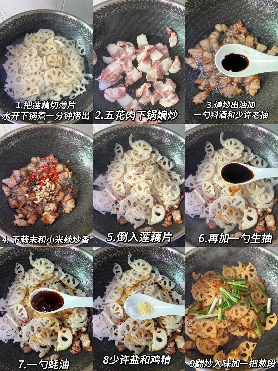 再倒少許油,下蒜末和干辣椒炒香,把蓮藕片倒進去,大火快速翻炒2分鐘。