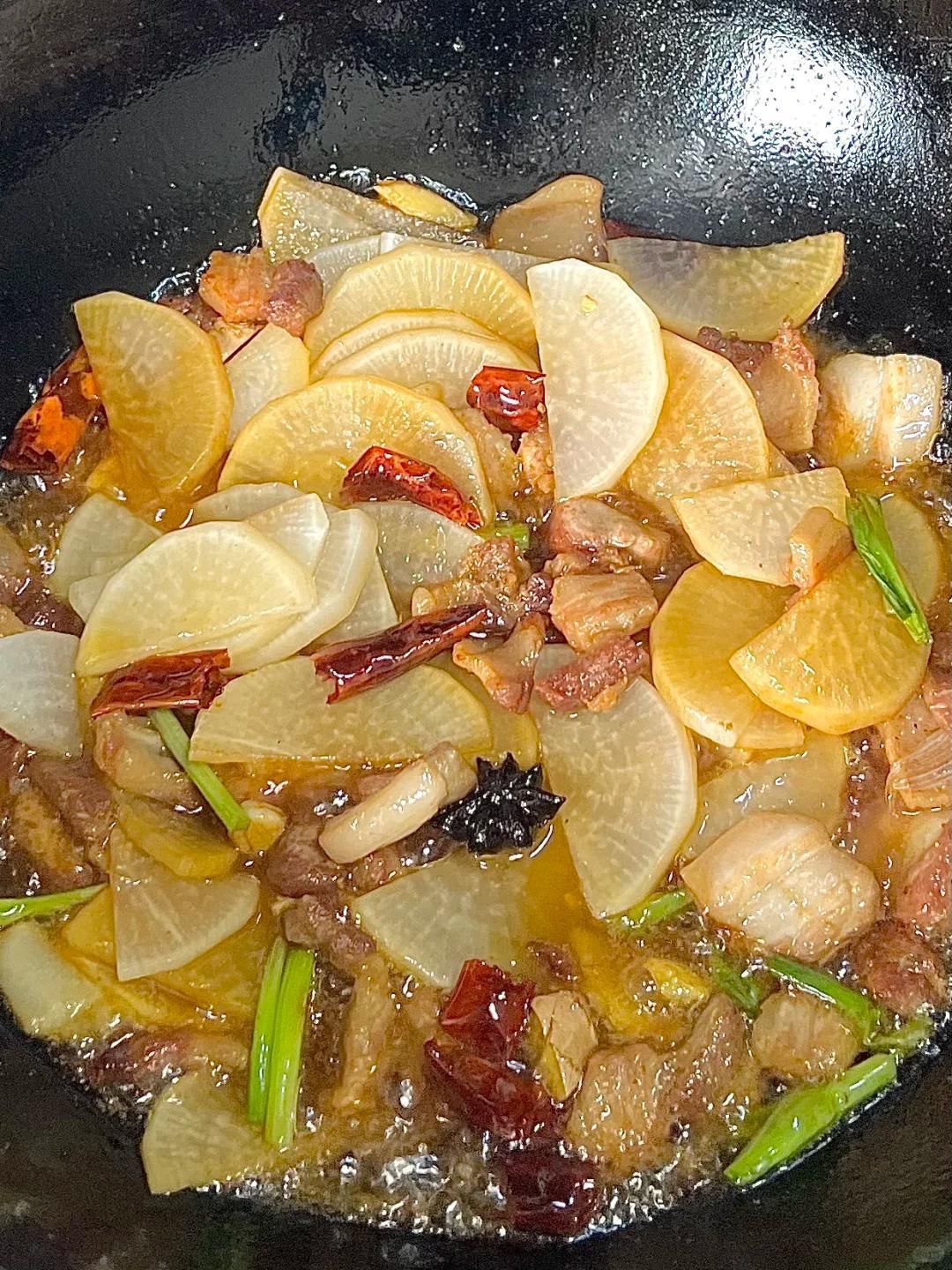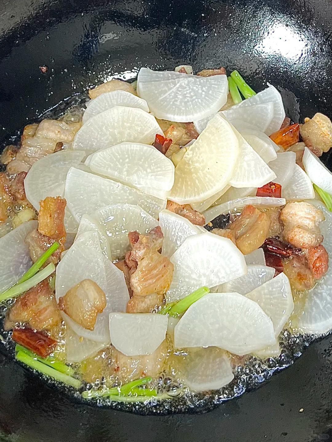 鍋里放少許油,下五花肉,蔥花和姜片爆香,把蘿卜塊倒進去翻炒幾分鐘,炒到蘿卜表面微微發(fā)焦。加足量熱水,沒過蘿卜,大火燒開后轉小火燉20分鐘,直到蘿卜變得軟爛。