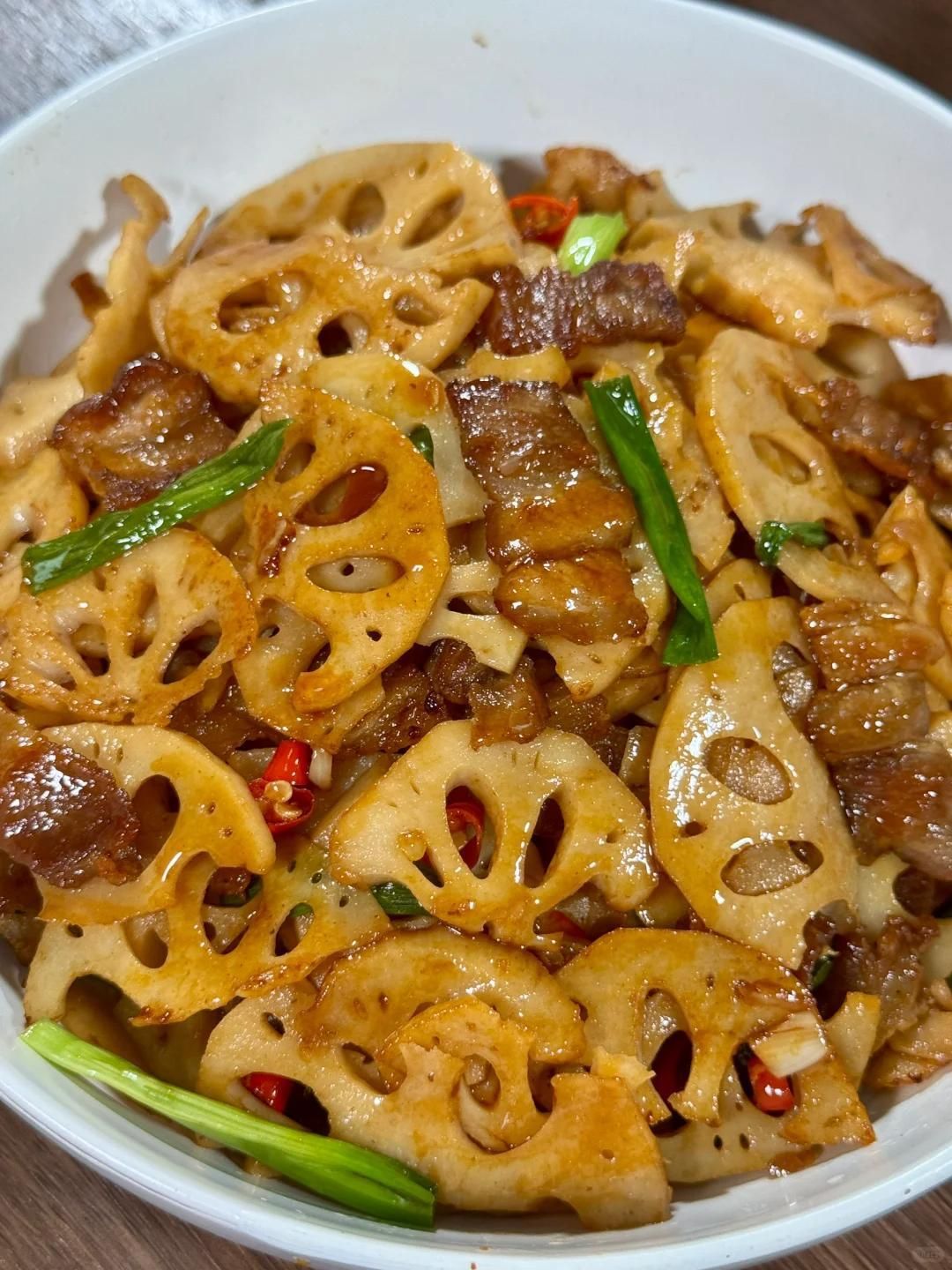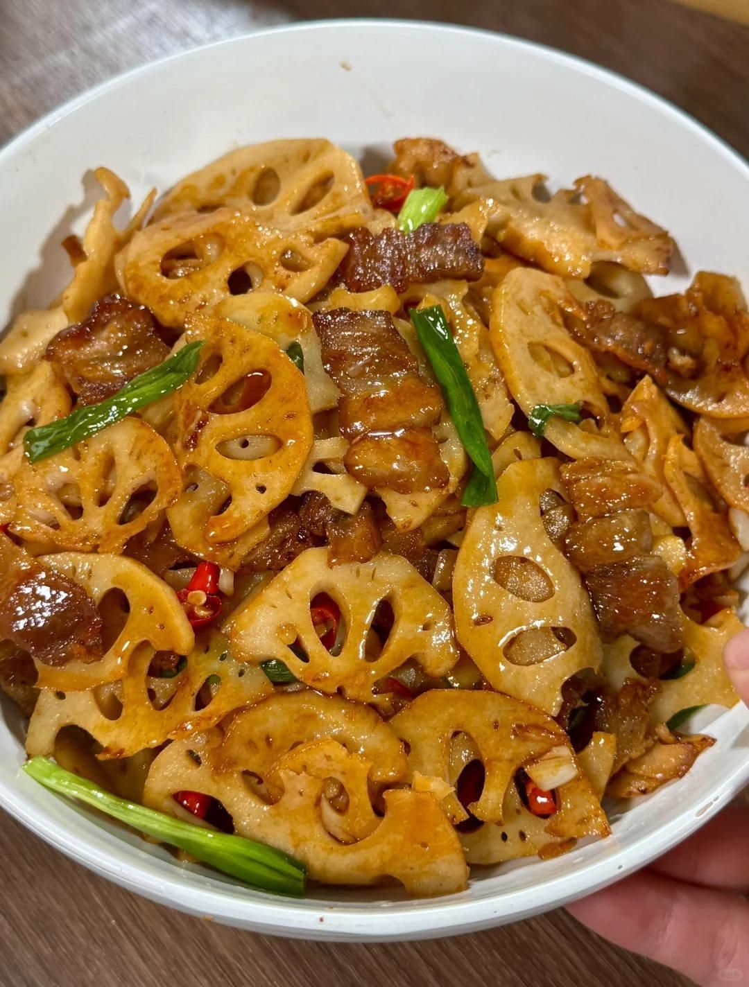 家常又下飯的是蓮藕炒肉片,蓮藕去皮切成薄片,用清水淘洗幾遍,洗掉表面的淀粉。