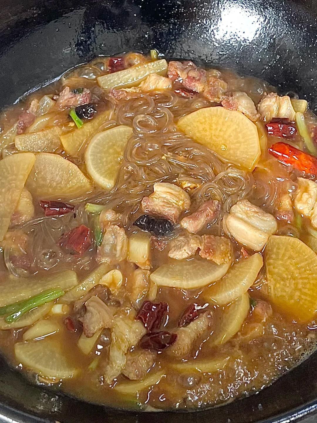 這時把粉條放進去,加一勺鹽、少許生抽和一點點胡椒粉調味,再燉5分鐘,讓粉條吸飽蘿卜的湯汁。