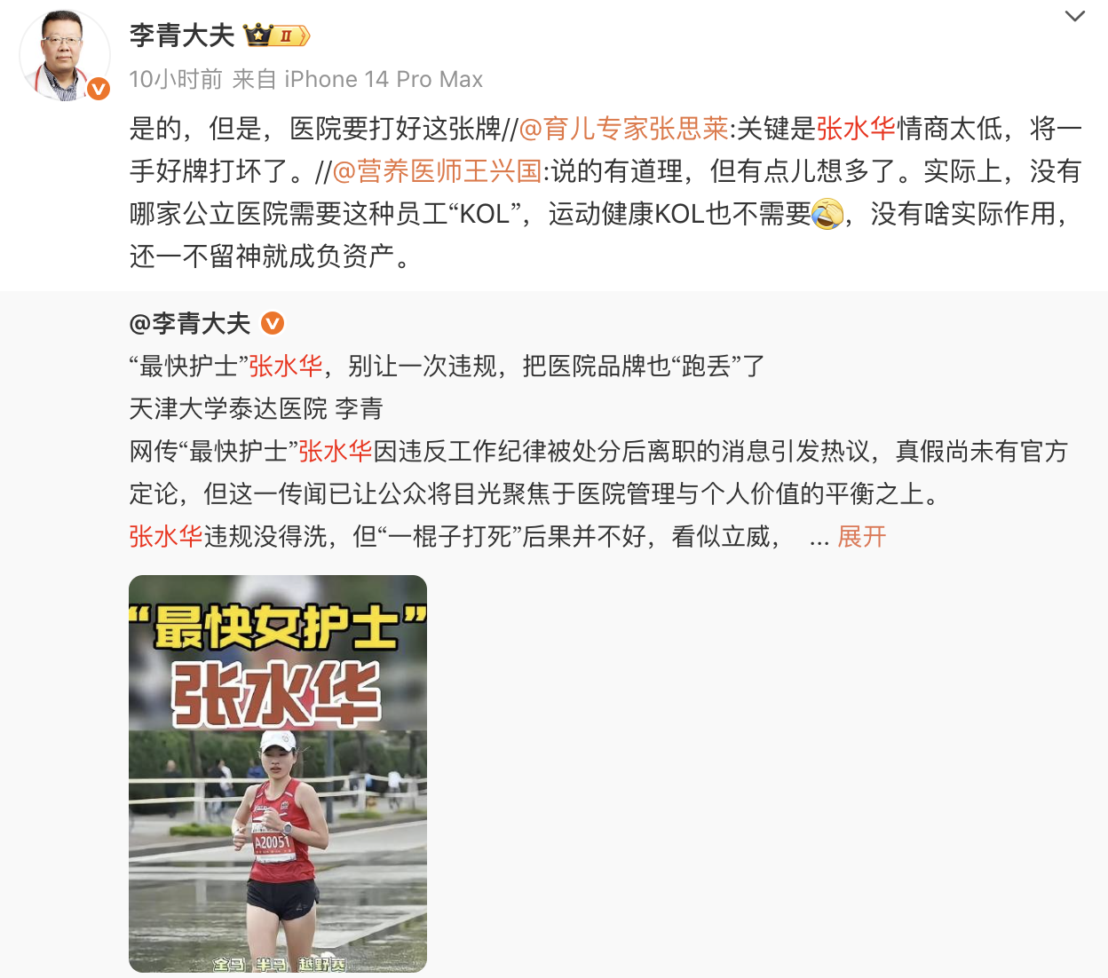 他也支持醫(yī)院對張水華進行調(diào)崗。李青大夫認為張水華可以給醫(yī)院帶來巨大的流量:“她其實是醫(yī)院天降的健康KOL。從品牌資產(chǎn)方面:全網(wǎng)300萬粉絲,話題播放量破10億,等同每年省下千萬廣告費;到勵志符號:從鄉(xiāng)鎮(zhèn)姑娘到最快護士,契合健康中國敘事,自帶正能量。”
