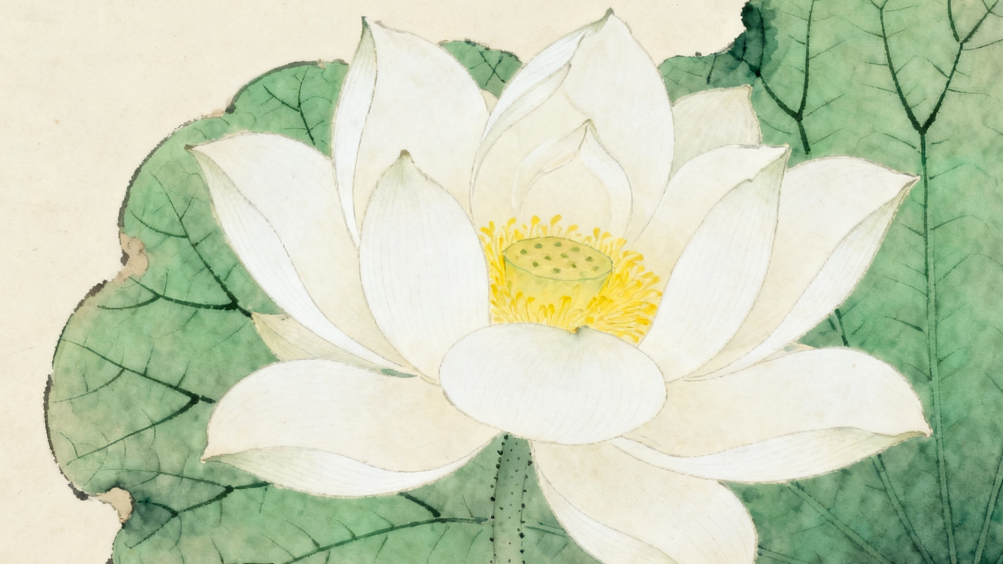 《出水芙蓉圖》正中一荷獨秀,嫩綠花心,鵝黃花蕊,蓮葉碧玉如洗,荷花神韻漫溢。