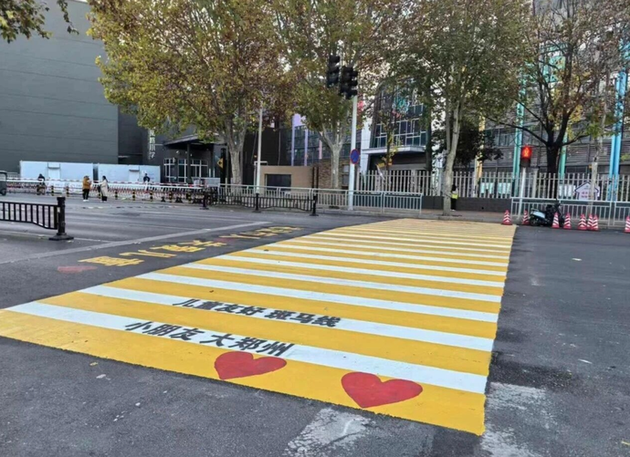 近日,鄭州的大街小巷、校園周邊悄悄多了一抹亮眼風(fēng)景——黝黑的瀝青路上,彩色斑馬線帶著醒目的視覺警示效果,“注意觀察兩側(cè)來車”“禮讓行人 關(guān)愛兒童”的暖心提示語,搭配“見鄭友好 童創(chuàng)未來”“小朋友 大鄭州”的童趣標(biāo)語,讓原本單調(diào)的斑馬線變成了守護(hù)孩子的“安全風(fēng)景線”。