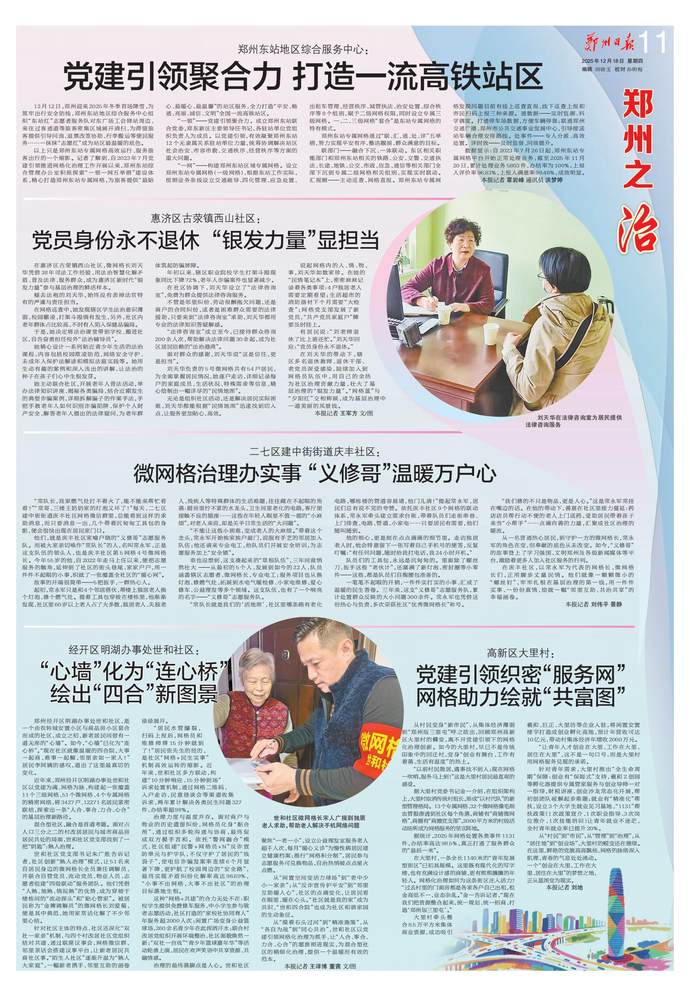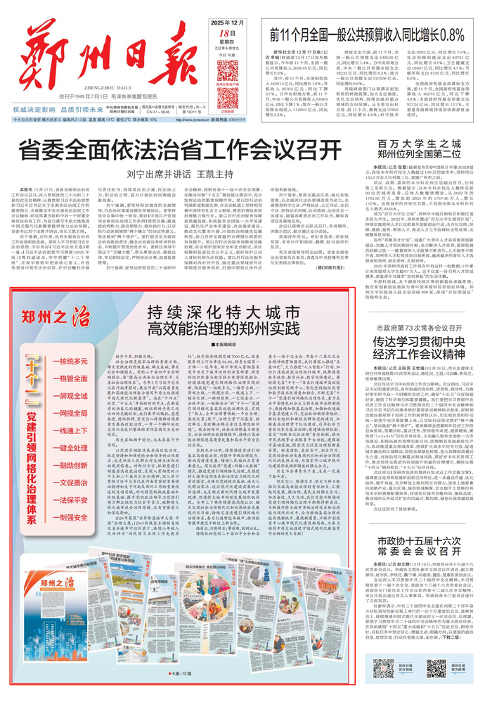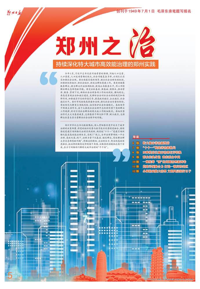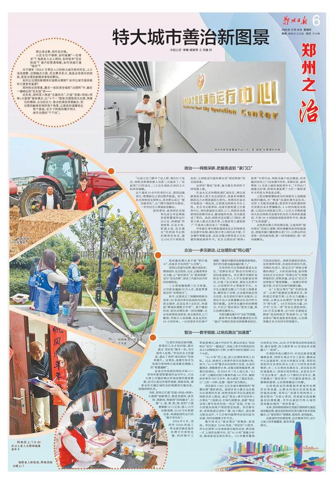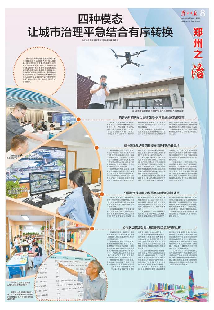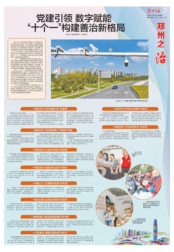 2024年榮獲“世界智慧城市大獎·中國”治理大獎;12345熱線在全國副省級及省會城市中位列前十,連續八年被人民網評為“網民留言辦理工作先進單位”;數字經濟規模突破7000億元,政務服務網上可辦率達94.4%,躋身全國第一方陣……近年來,鄭州市深入貫徹落實黨中央關于城市治理的決策部署,將黨的組織優勢與數字技術優勢深度融合,持續推進黨建引領網格化治理實踐創新,構筑起“一核統多元、一格管全面、一屏觀全域、一網攬全局、一線通上下、一鍵全處理、一融助創新、一文促善治、一法保平安、一制強安全”的“十個一”黨建引領網格化基層高效能治理體系,實現了“線上,全市治理事項統一平臺辦理、高效處置;線下,治理力量下沉基層、貼近群眾,有效解決群眾身邊急難愁盼問題”。現在的鄭州,社會治理根基不斷夯實,社會治理效能持續提升,持續以高效能治理促進高質量發展和高水平安全良性互動。